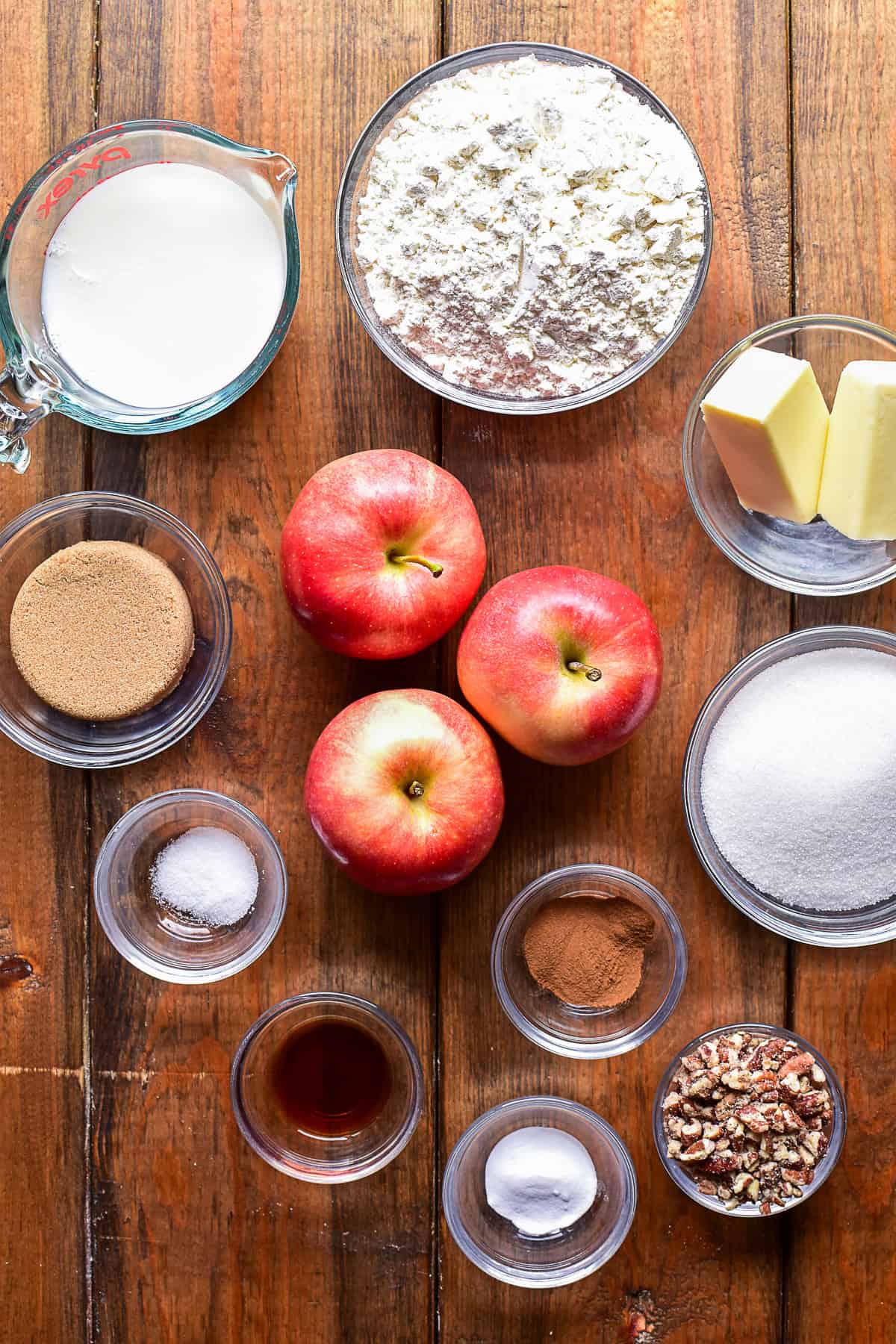 This cake is made with 2 cups of fresh, chopped apples, ground cinnamon, brown sugar, and pecans. Pretty much everything you need to make the best fall apple cake that’s equally delicious for breakfast OR dessert!