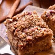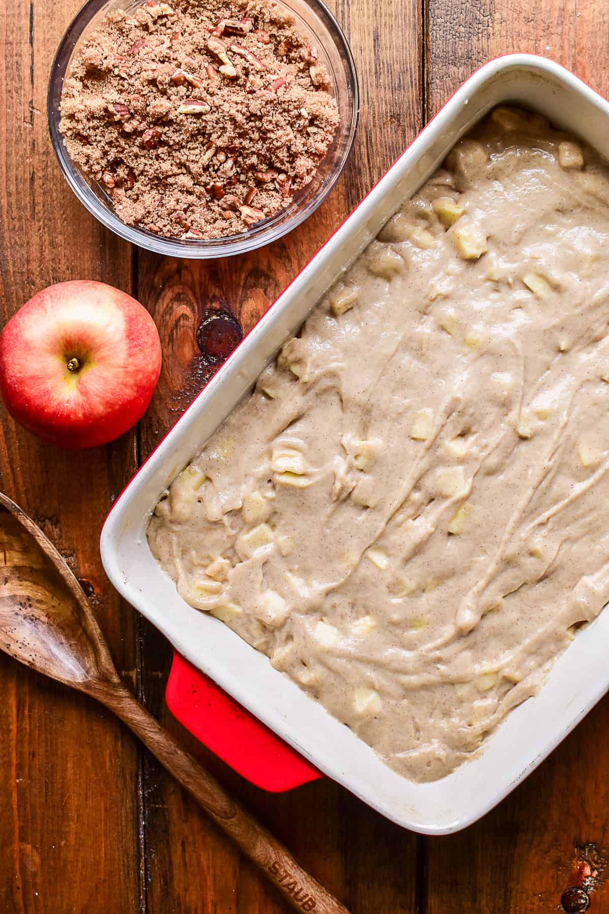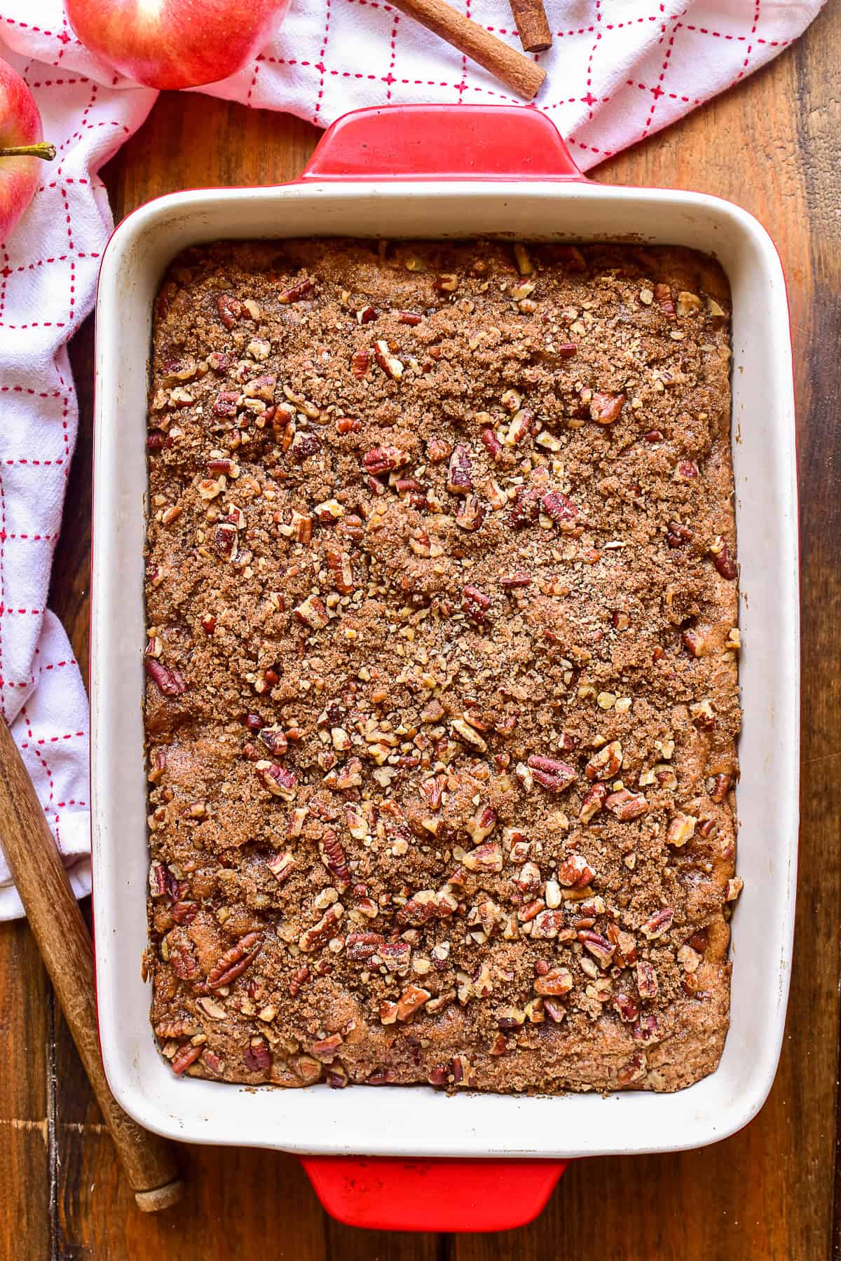 Crumb topping – Brown sugar, cinnamon and chopped pecans create a simple topping that’s perfect for this recipe. For a more decadent cake, substitute streusel topping or cream cheese frosting.