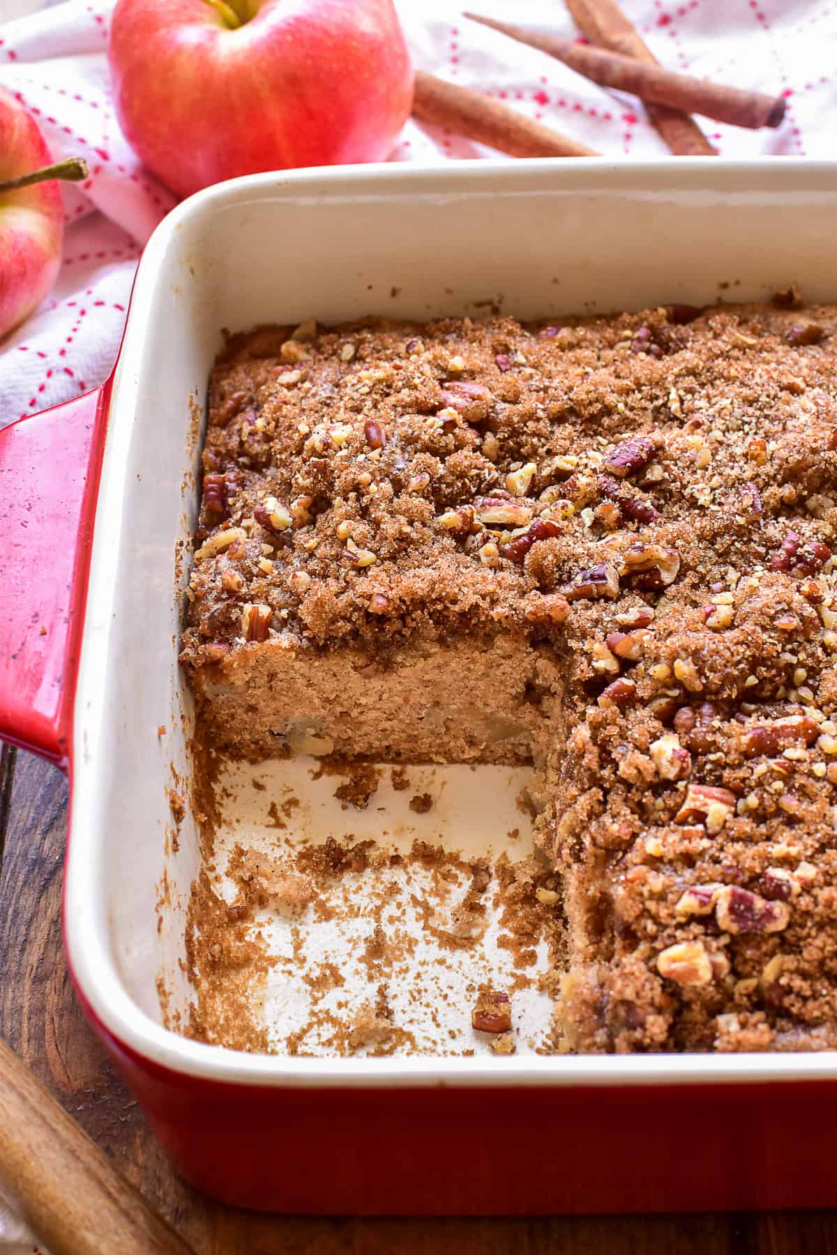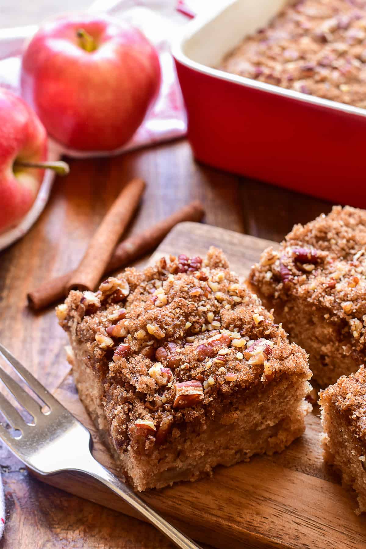 Perfectly sweet, moist Apple Crumb Cake – made with fresh apples, ground cinnamon, and a delicious brown sugar pecan topping. One of our family’s favorite desserts… and it doubles as a sweet breakfast treat!