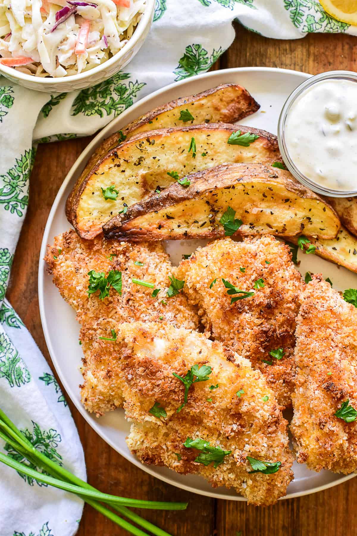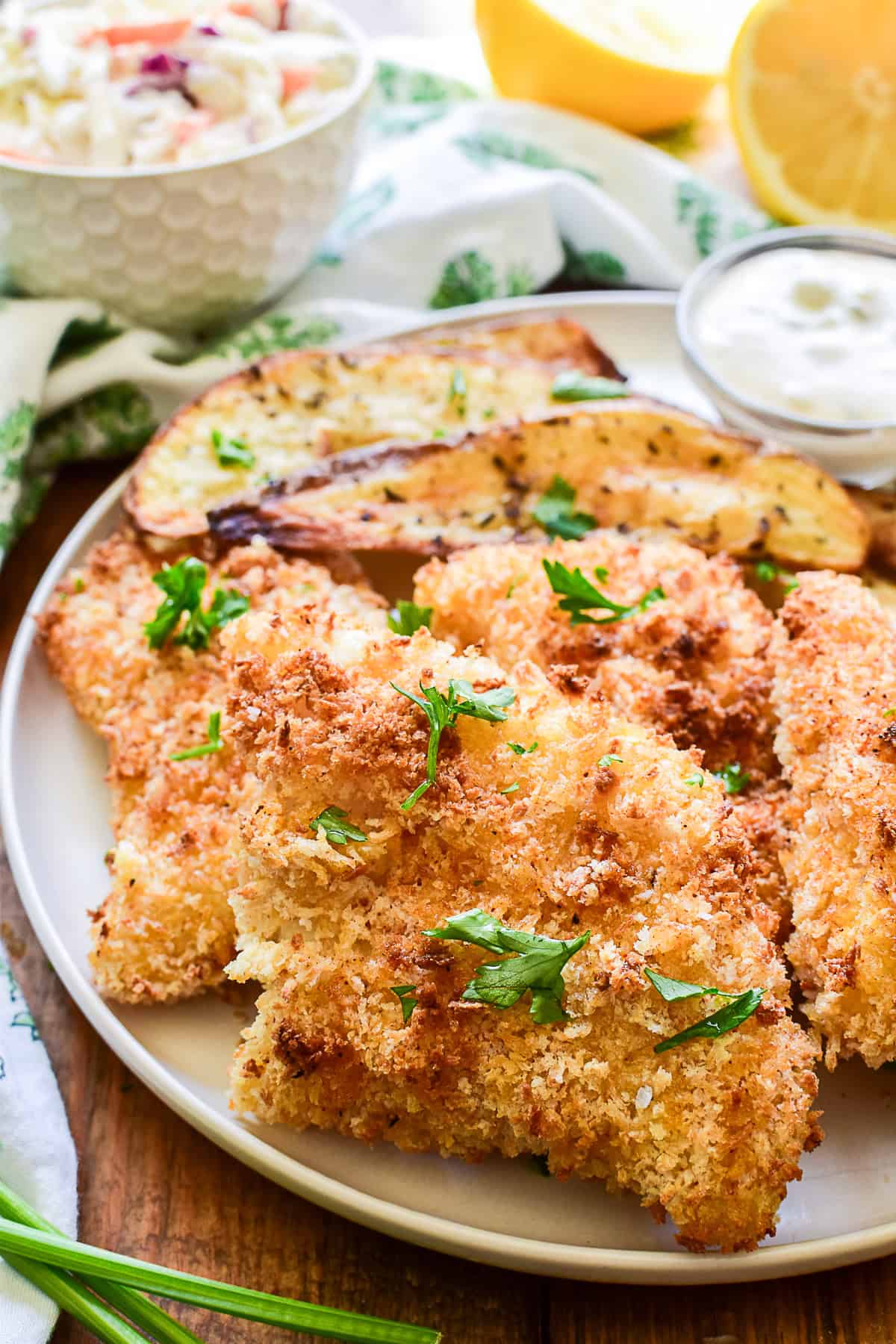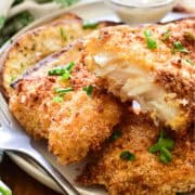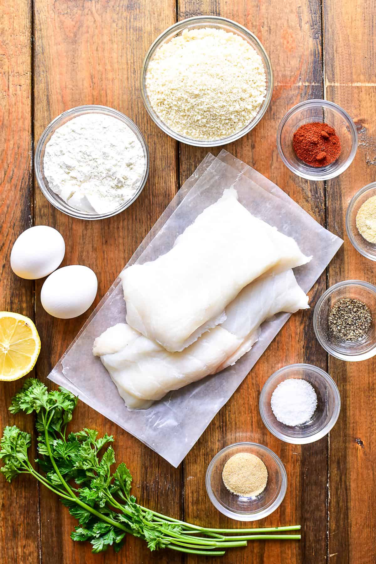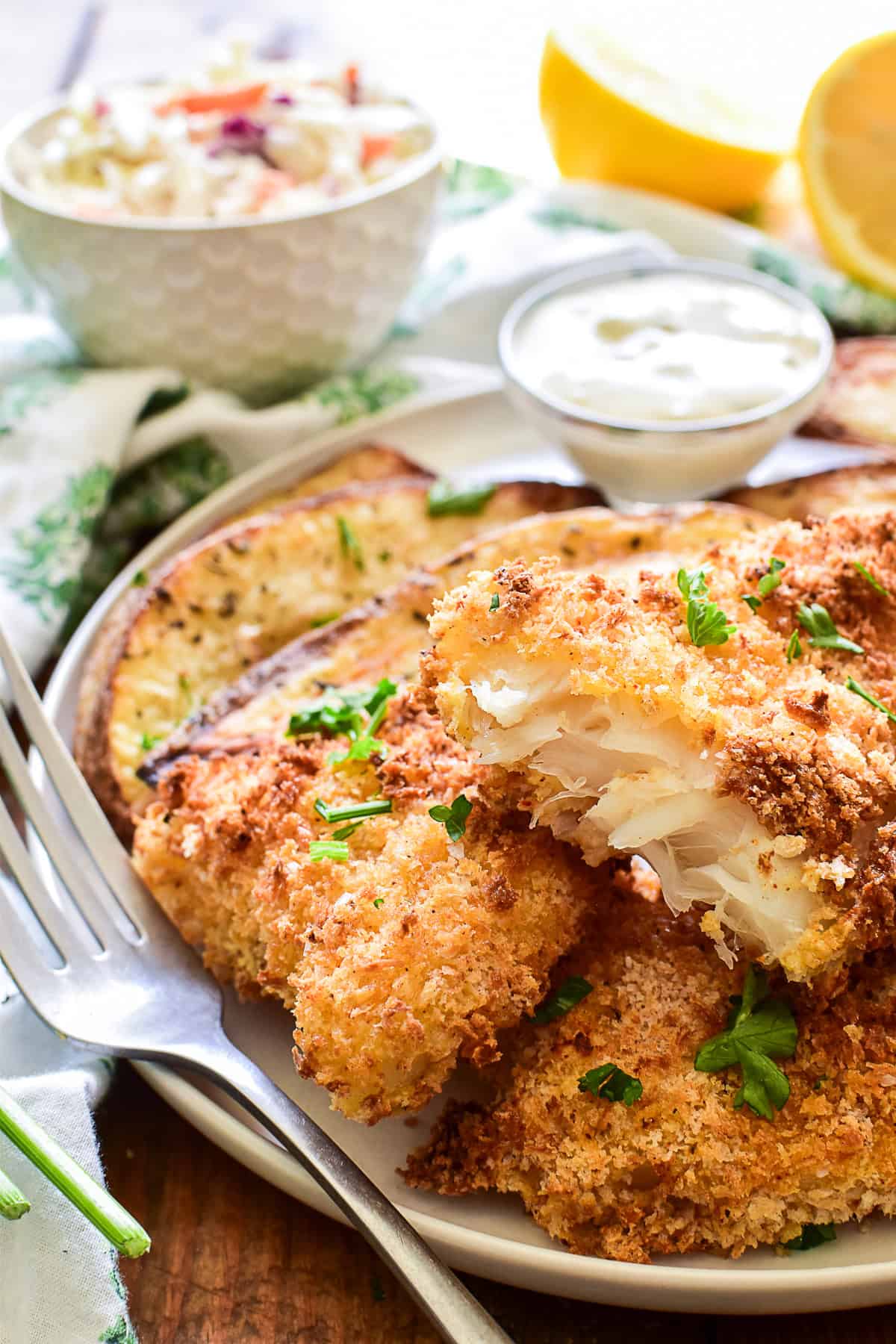 Breading – All purpose flour, beaten eggs, and panko bread crumbs create a crispy breading that sticks to the fish and holds up well in the air fryer.