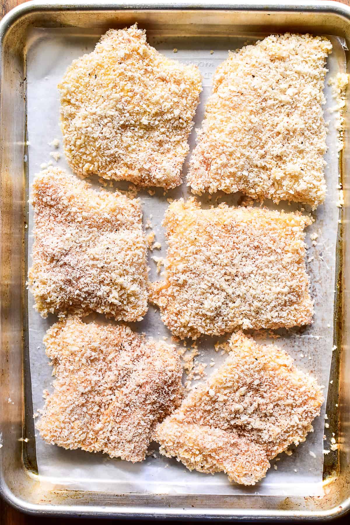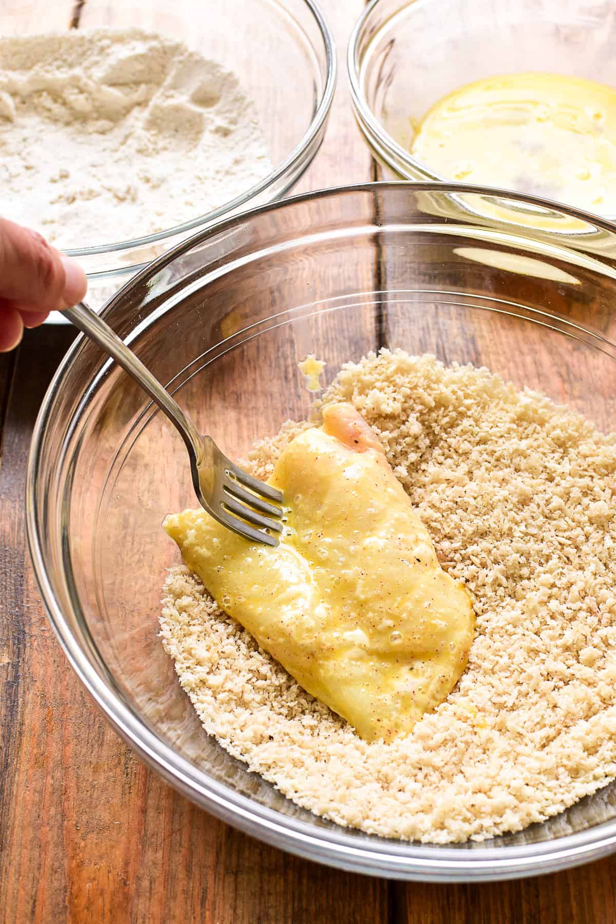 - Using 3 bowls, add the flour and half of the seasonings to the first one, add the beaten eggs to the second one, and add the panko crumbs and remaining seasonings to the third one. Mix the seasonings into the flour and bread crumbs.