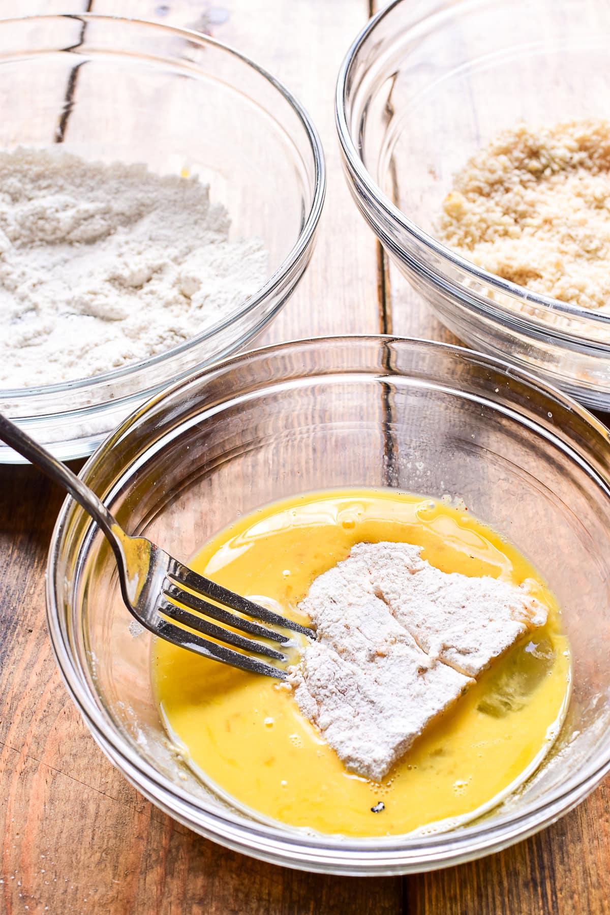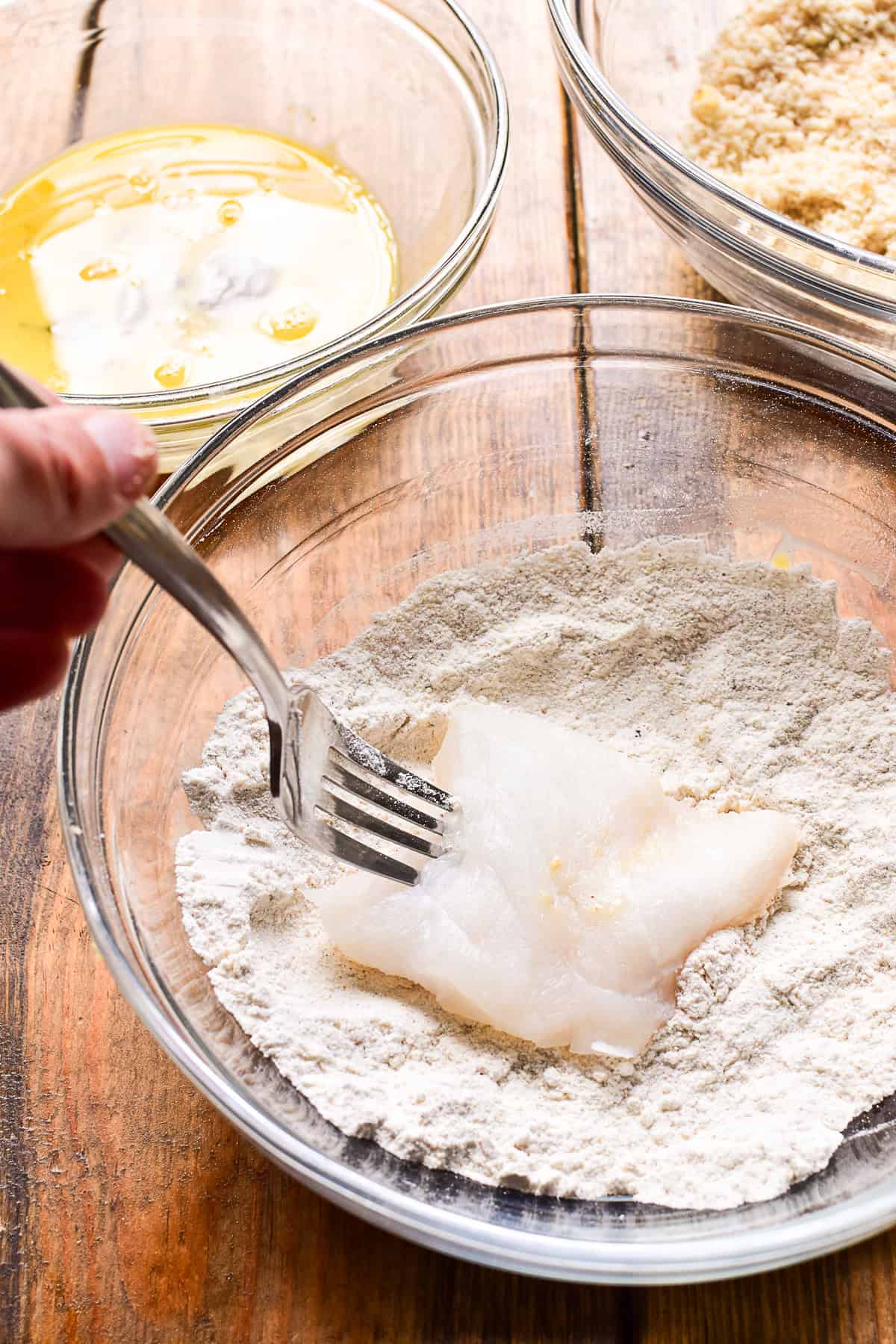 - Using a fork, dip each portion of fish into the flour mixture, followed by the egg mixture and finally the bread crumbs. Be sure the fish is fully coated after each step, using your hands to press the bread crumbs onto the fish if necessary.