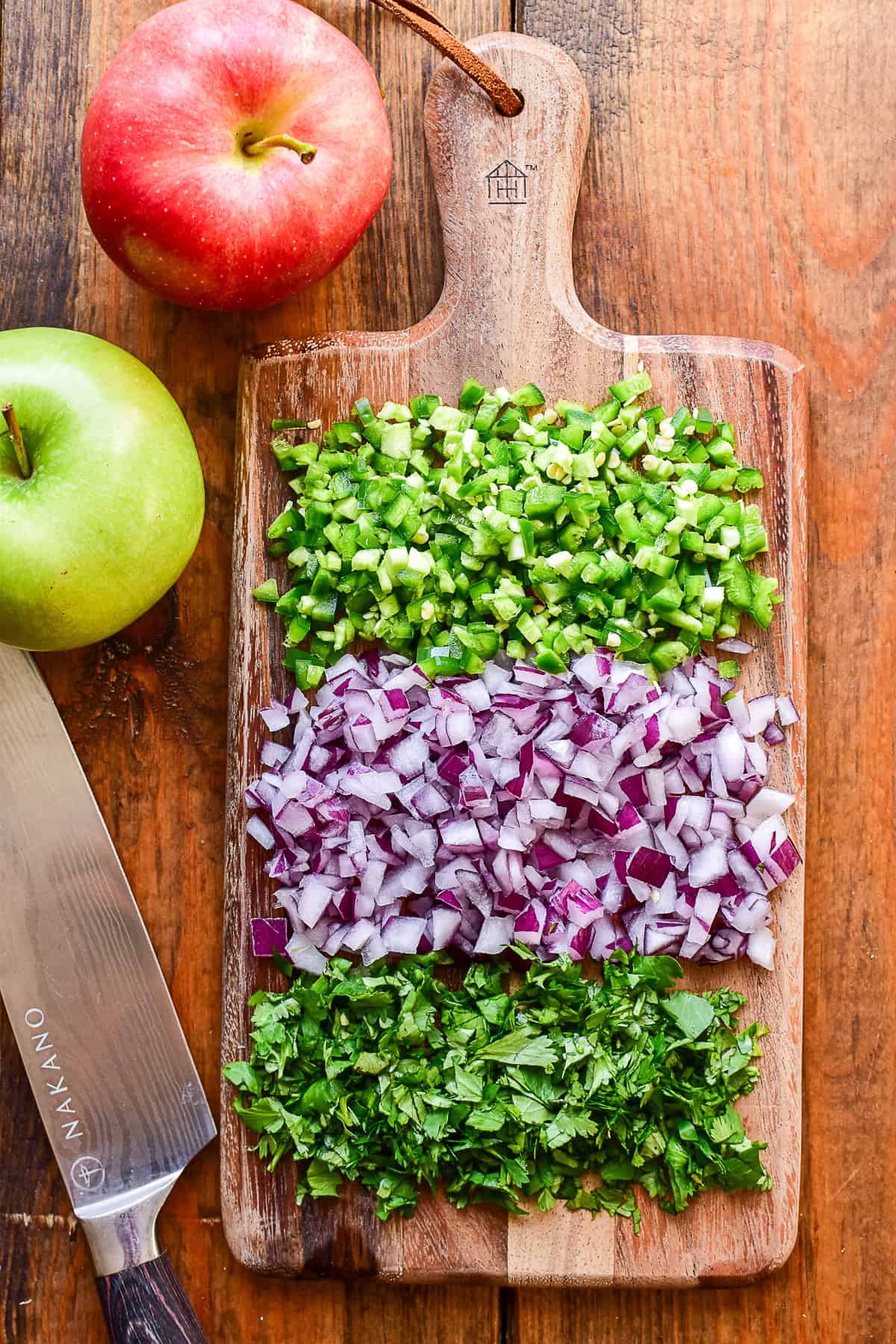 Chop the ingredients. Finely chop the apples, onions, jalapeños and cilantro and combine them all in mixing bowl.