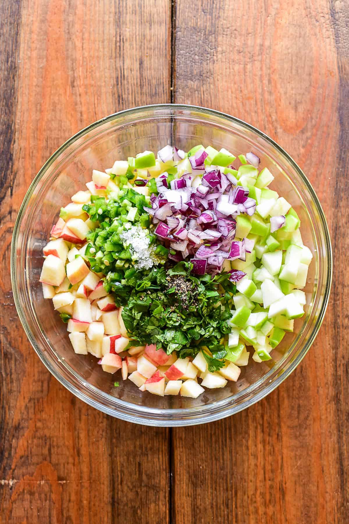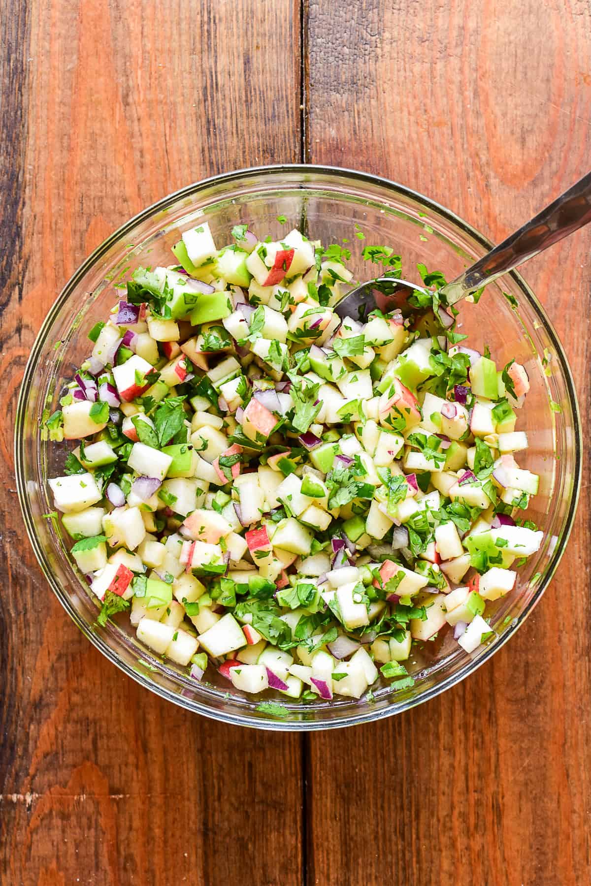 - In a medium mixing bowl, combine the chopped apples, onion, jalapeño and cilantro.