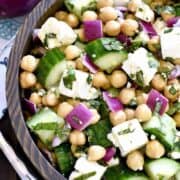 This Chickpea Cucumber Feta Salad has ALL the best flavors! Loaded with chickpeas, cucumbers, red onions, feta cheese, and fresh basil….this salad is so easy to make and is the perfect side dish for any meal!