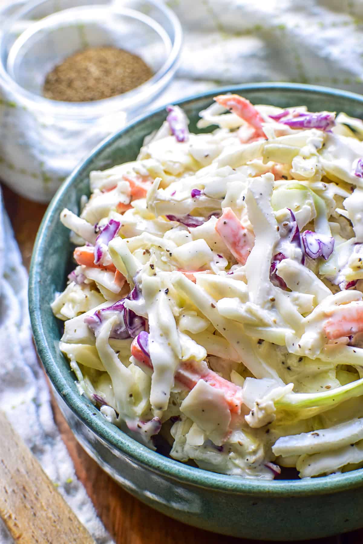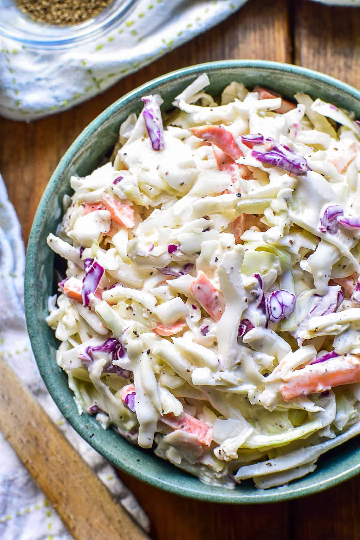 Perfectly Creamy Coleslaw, made with just a handful of ingredients and ready in 10 minutes or less. Our favorite side dish for picnics, cookouts, or Friday fish fry!