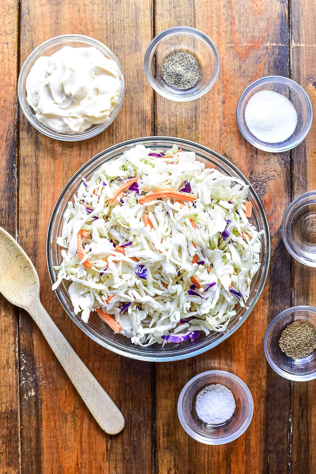 Vinegar – White vinegar gives the slaw a bit of tanginess and cuts the creaminess of the mayo. I used 1 1/2 Tablespoons white vinegar. For a sweeter flavor, substitute apple cider or white balsamic vinegar.
