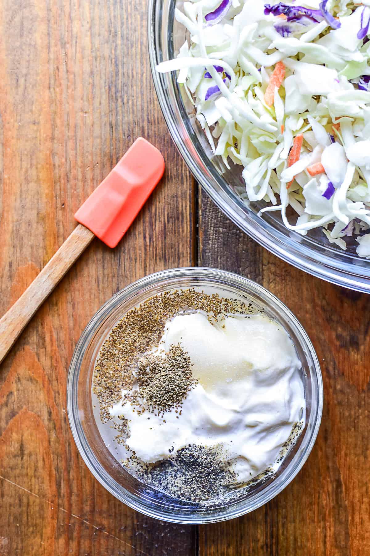 Combine the dressing & shredded cabbage. Pour the dressing over the shredded cabbage and mix to combine. Enjoy immediately or refrigerate until ready to use. *Coleslaw tastes best when it has some time to marinate, so if possible, make it at least 30 minutes in advance.