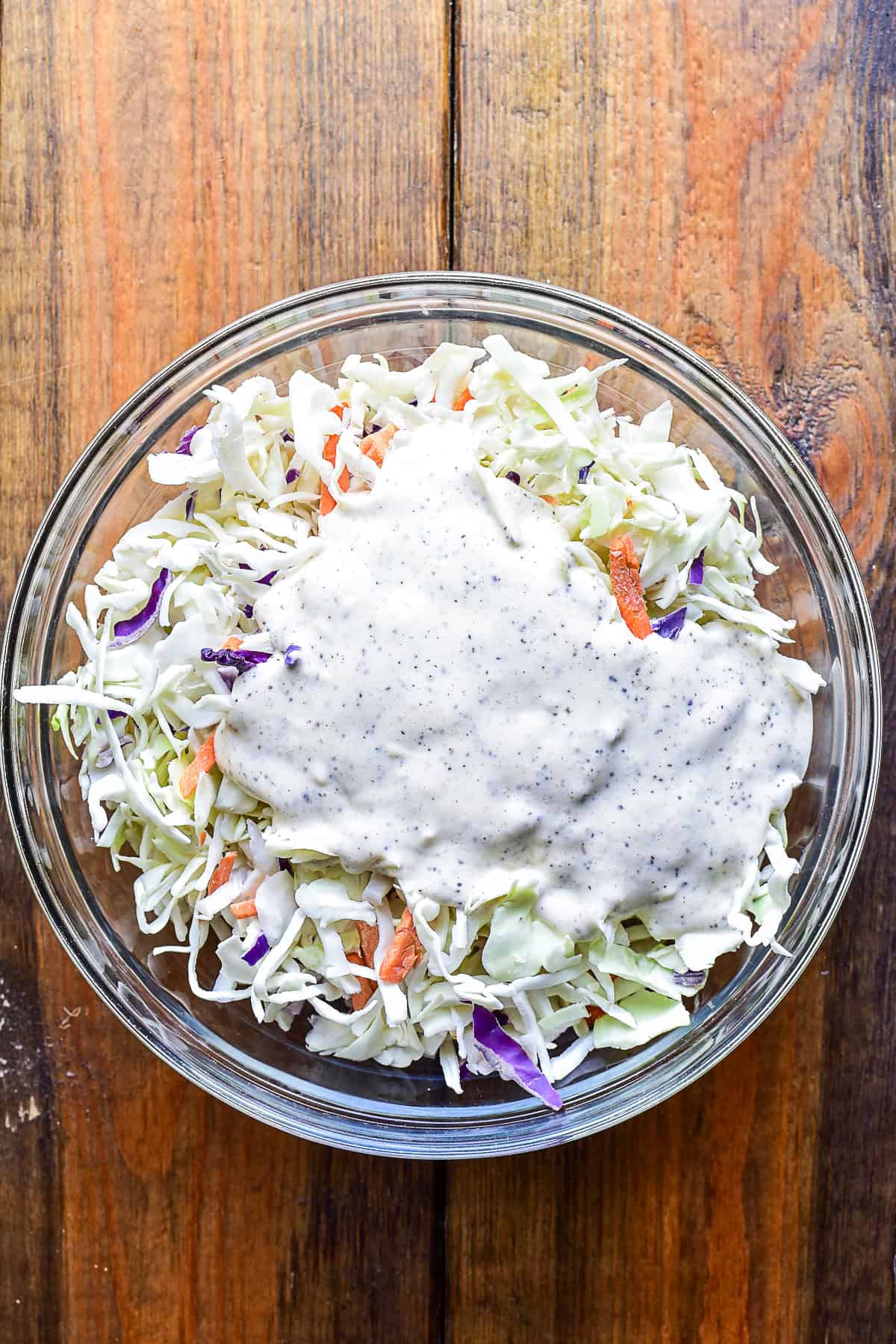 - Transfer the coleslaw mix to a large mixing bowl. Pour the dressing over the coleslaw mix and stir to combine.