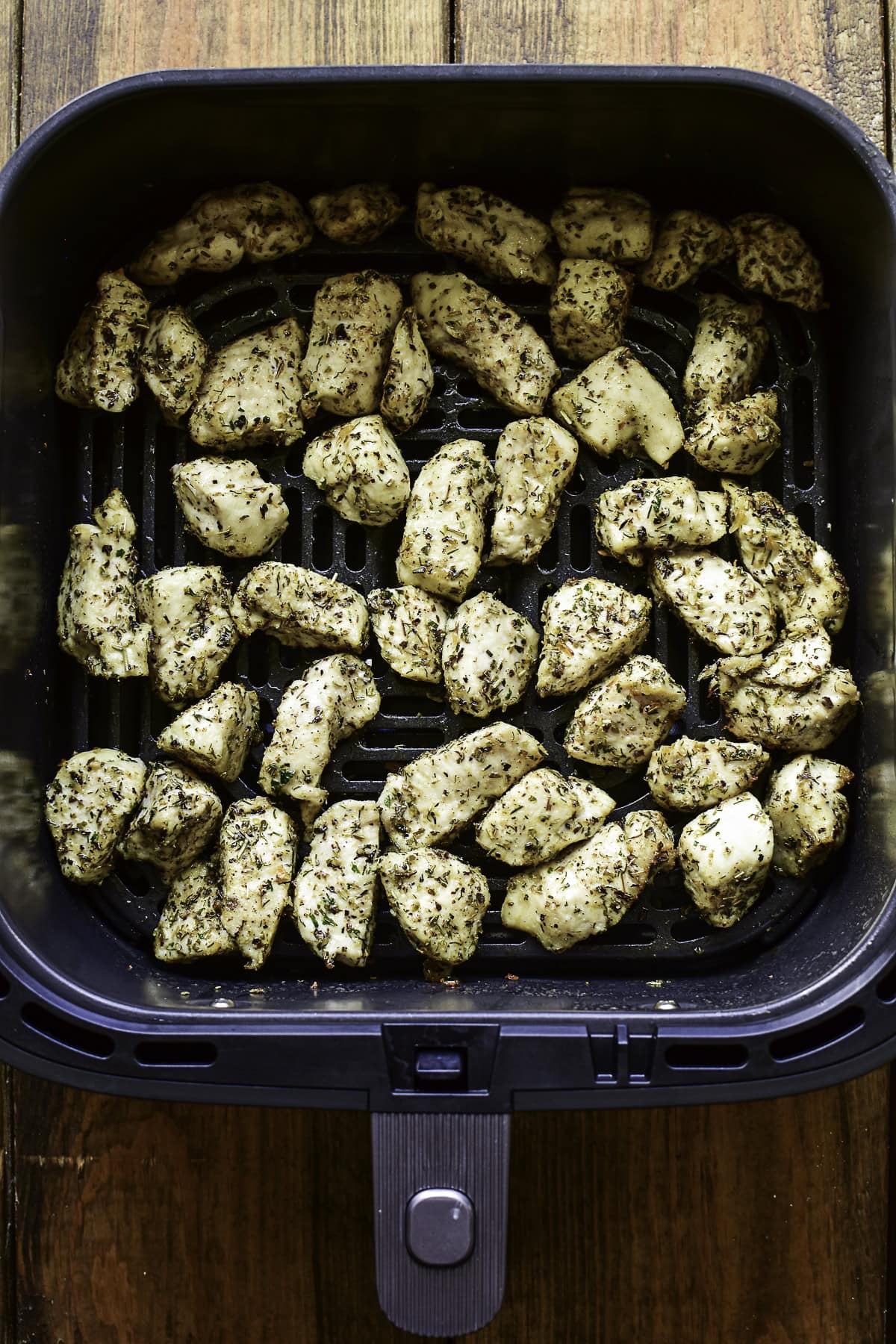 - Add seasoned chicken to air fryer basket and air fry at 385°F for 6-8 minutes or until internal temperature reaches 165°F. Shake the basket a few times during cooking. *For best results, use the grate inside the basket.