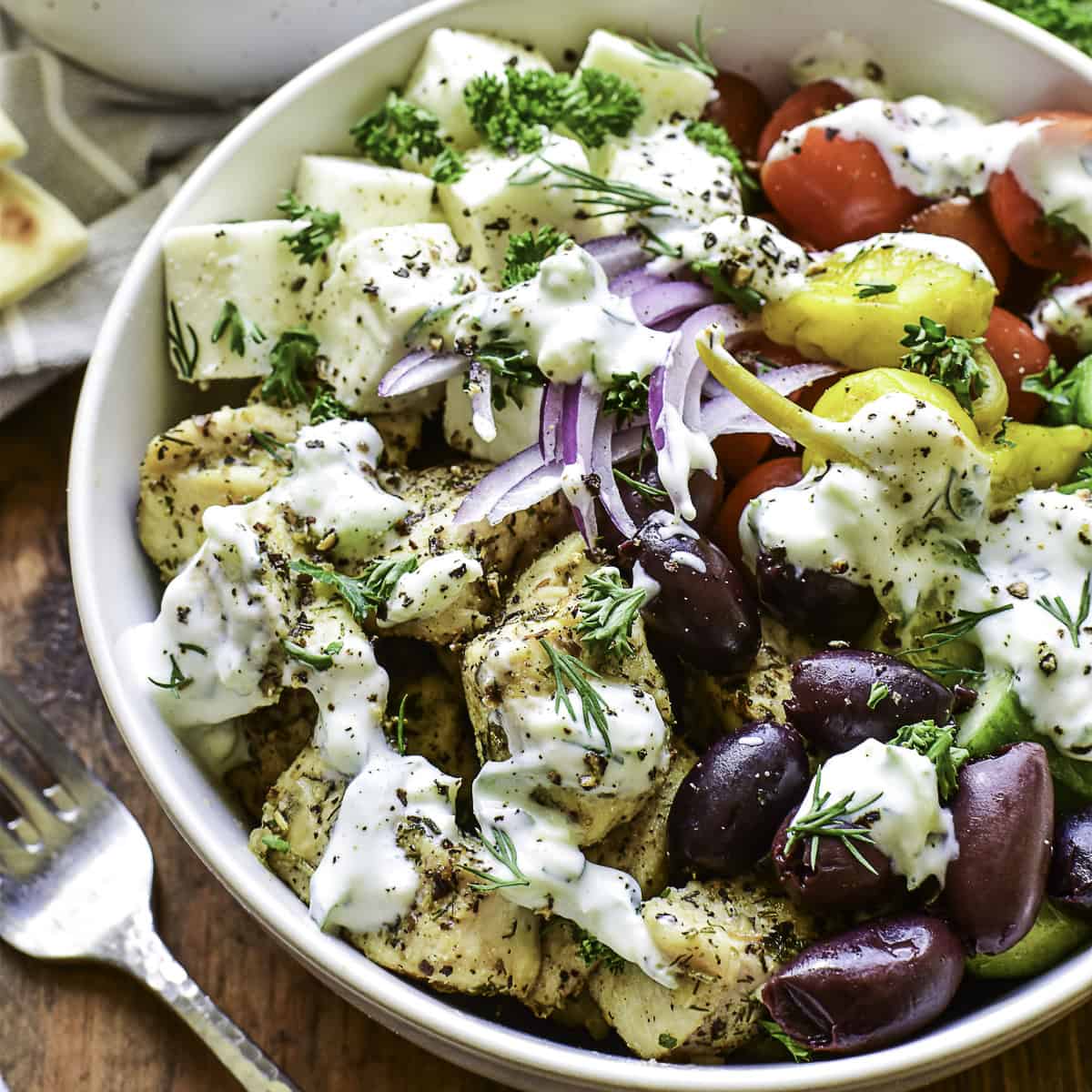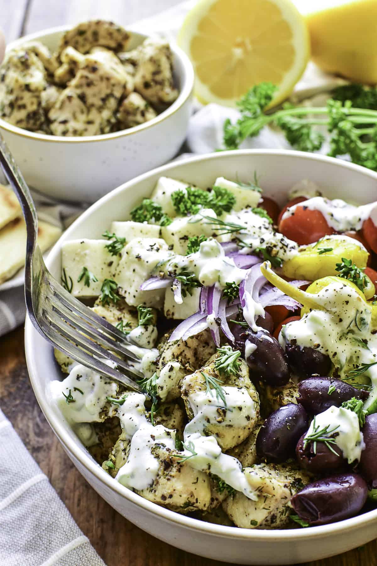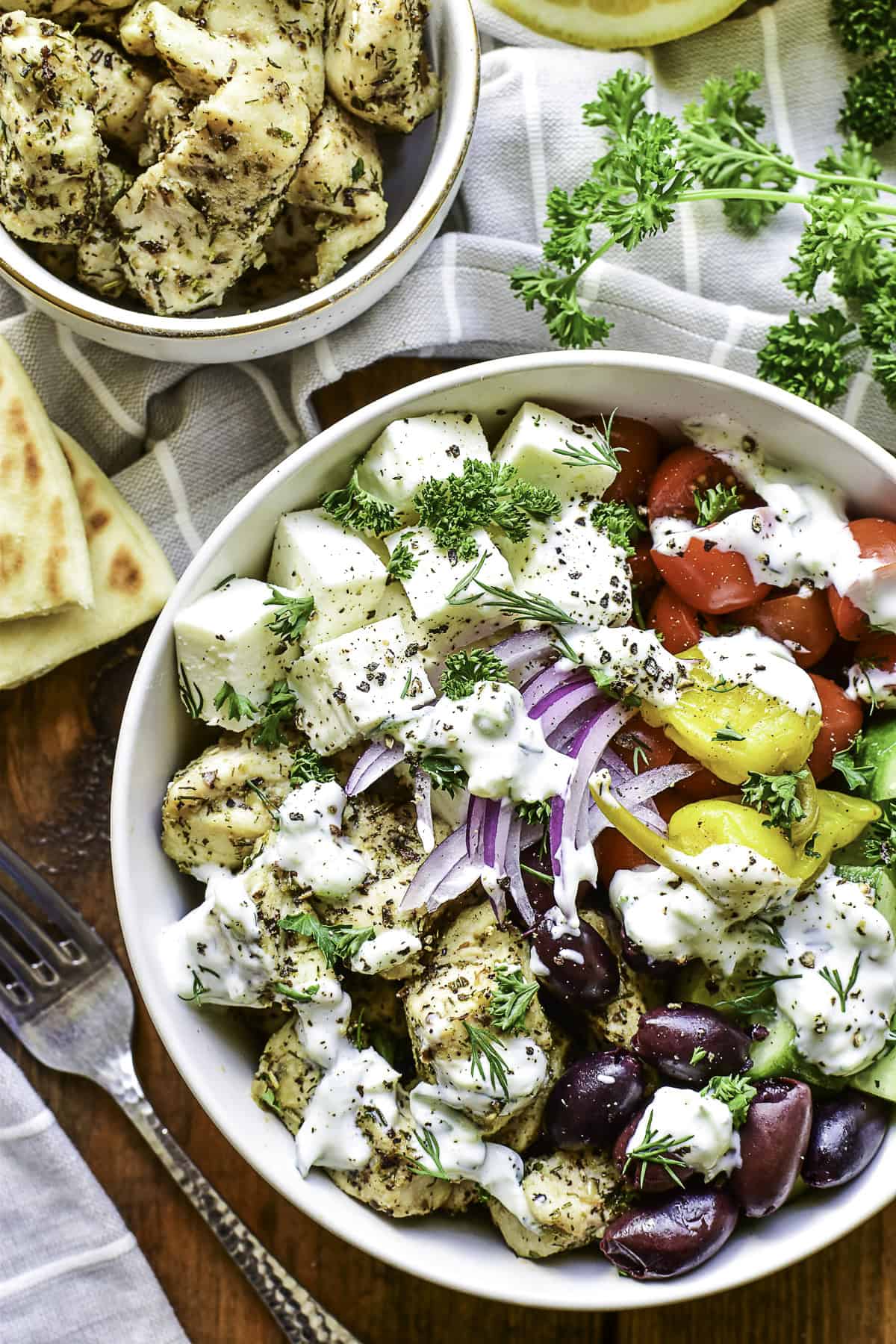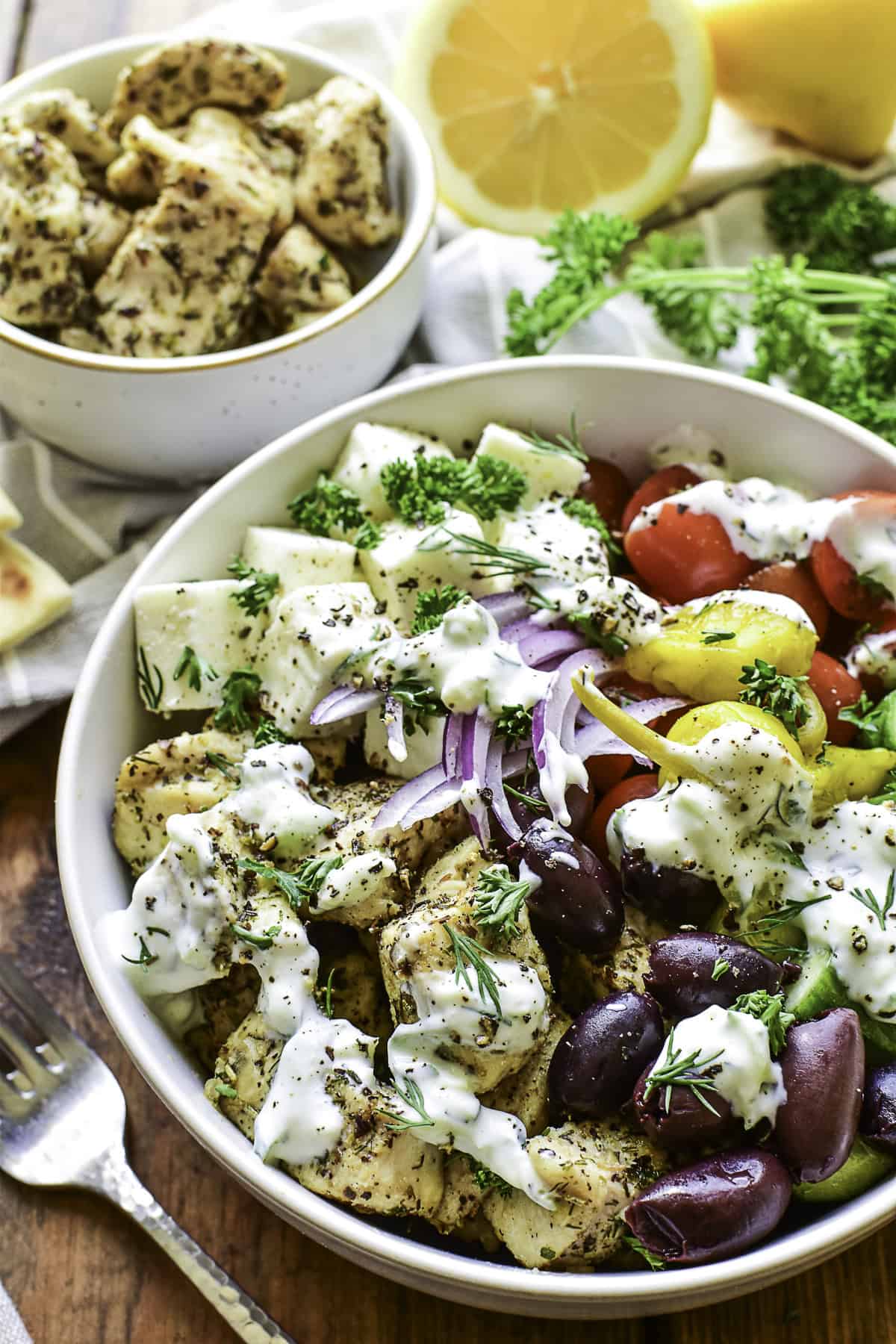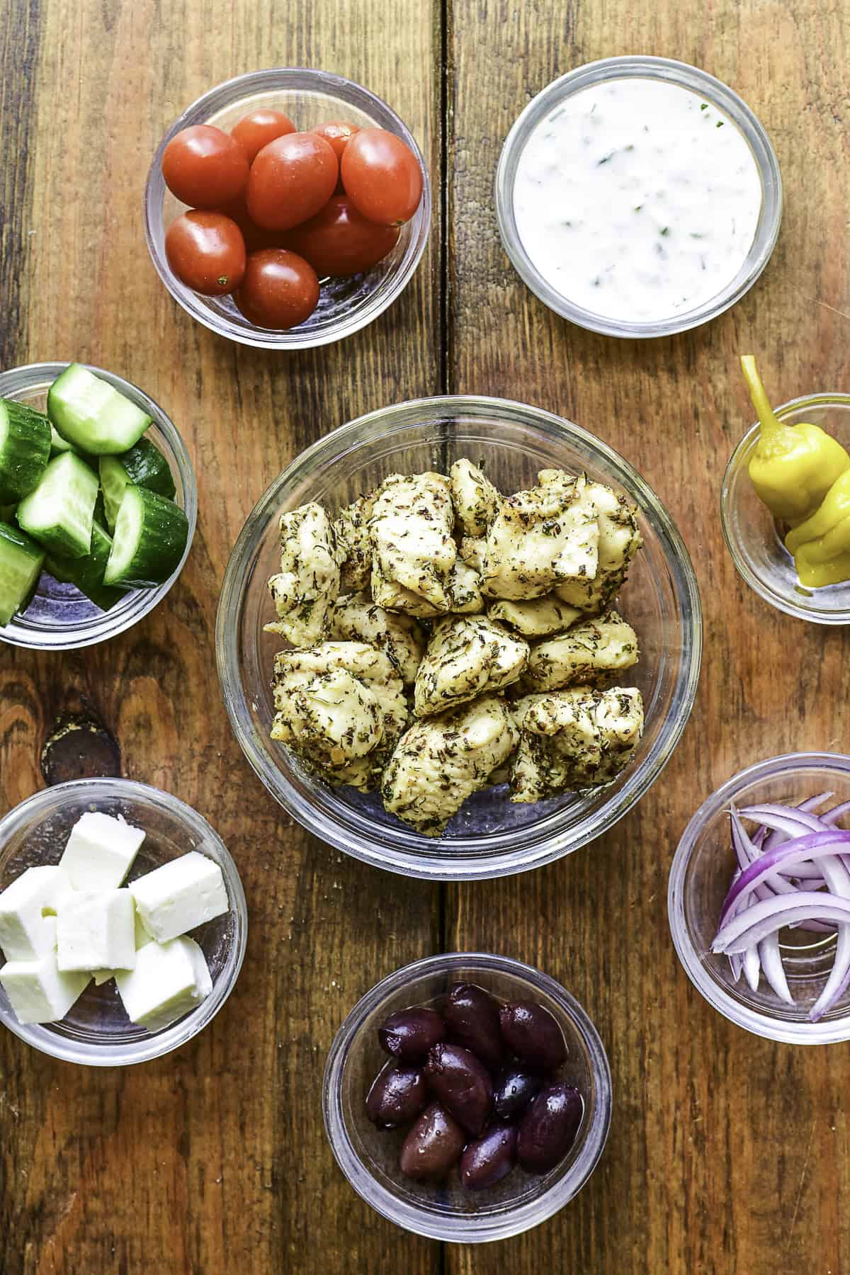 Chicken – I used 1/2 pound chicken per bowl, using my Greek Chicken Bites recipe. Substitute any type of Greek seasoned chicken or another protein if you prefer.