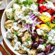- Assemble the bowls by dividing the chicken, cucumbers, tomatoes, olives feta, red onion, and pepperoncinis evenly between 2 bowls.