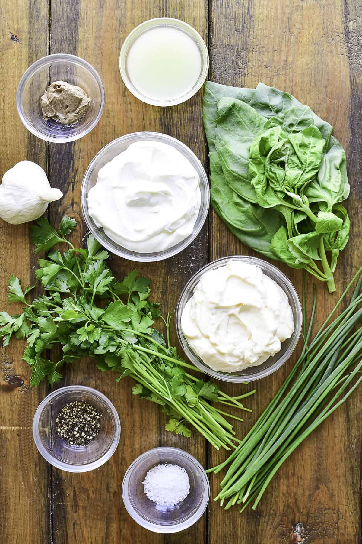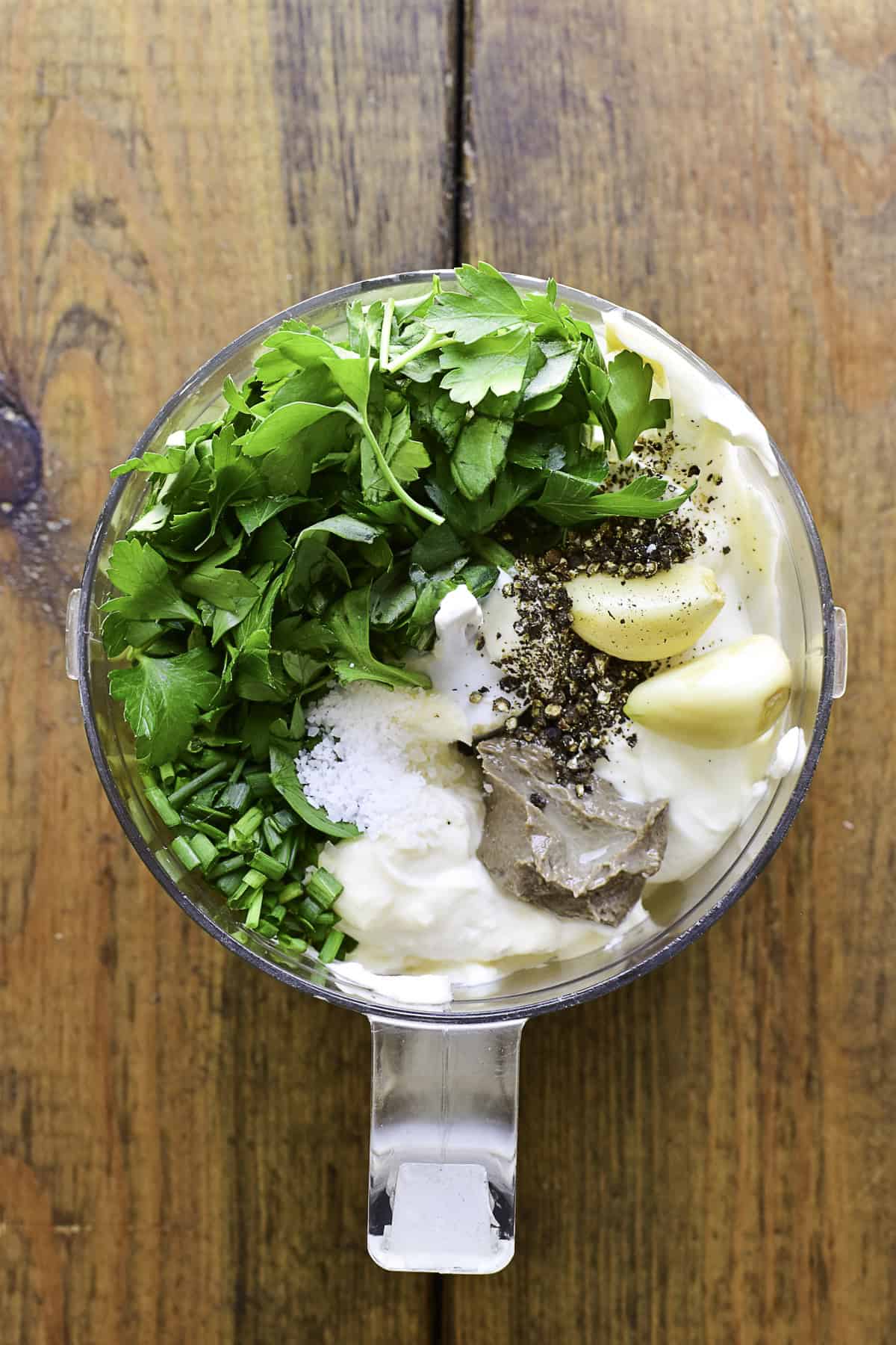 Measure & prep the ingredients. Measure the mayo, sour cream, lemon juice and anchovy paste. Roughly chop the fresh herbs garlic.
