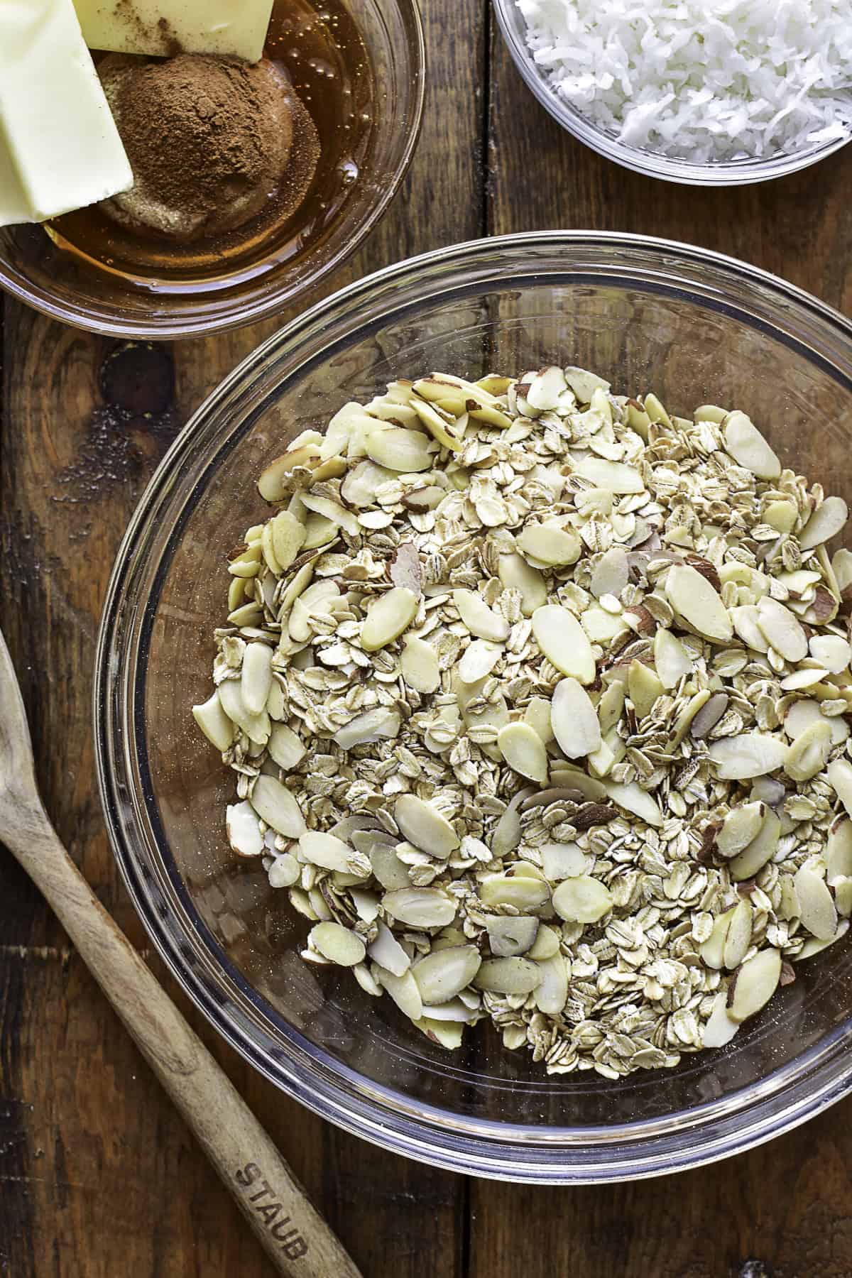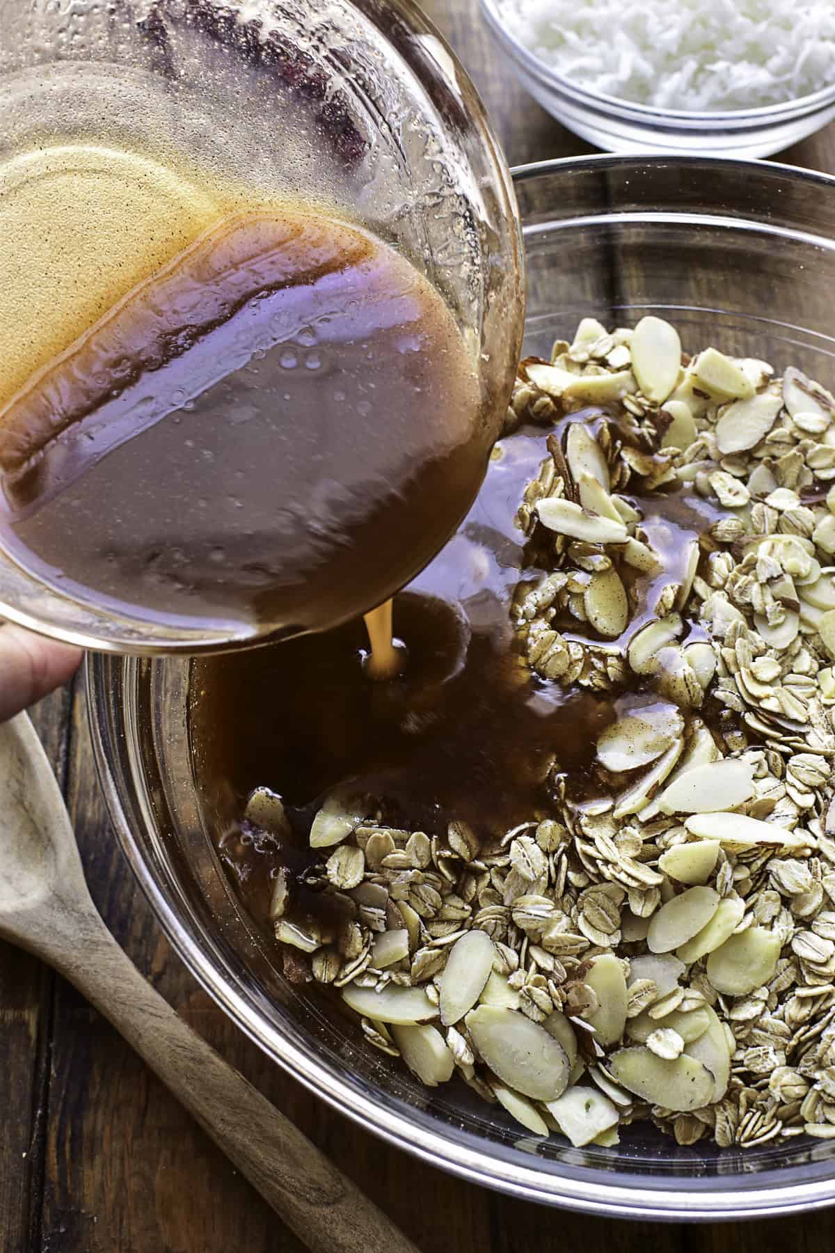 - In a large mixing bowl, combine the oats and almonds. Mix well.