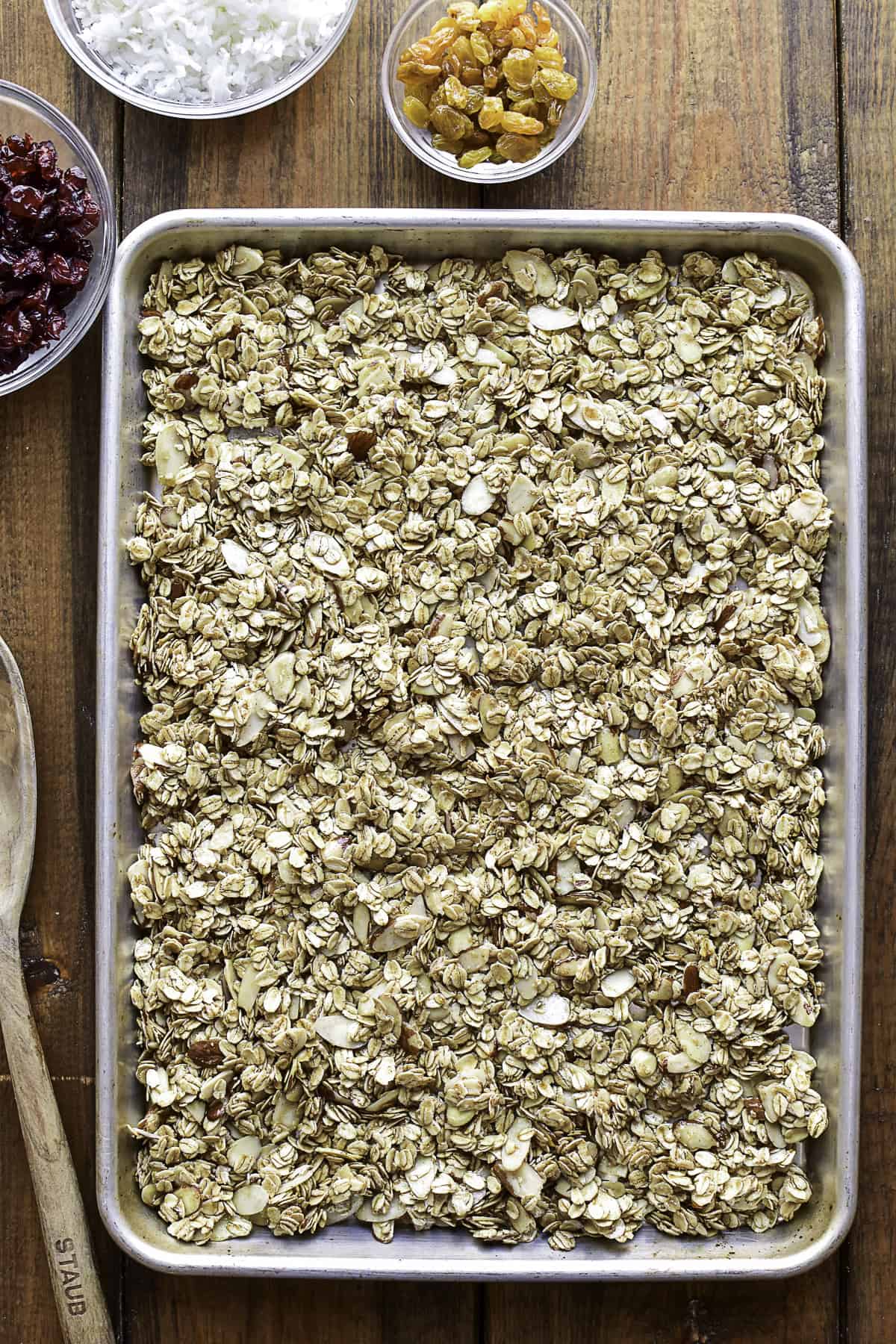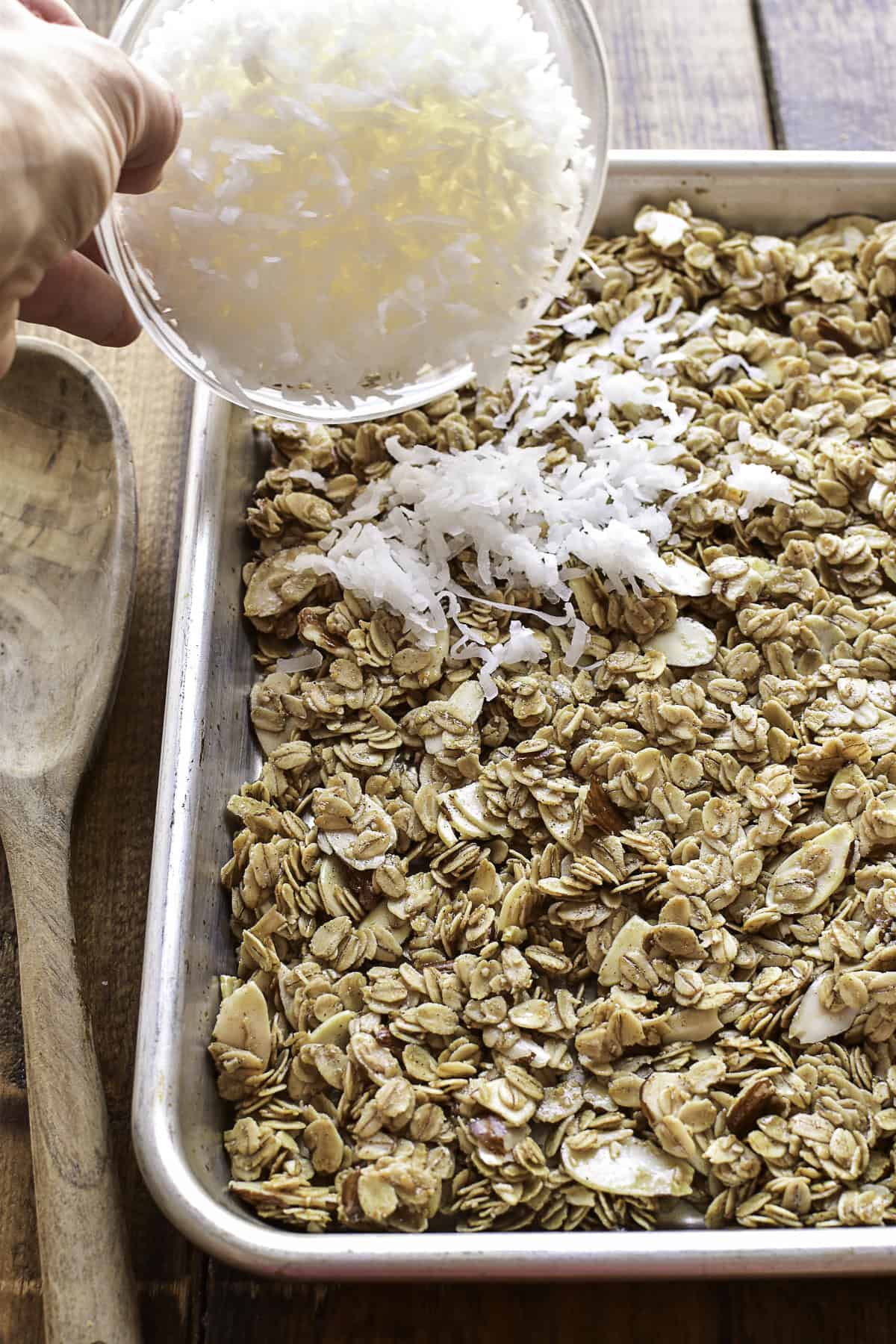 Coconut – Sweetened shredded coconut adds additional flavor, texture, and sweetness to the granola. Use unsweetened for less sweetness, flaked coconut for bigger pieces, or omit it altogether if you’re not a coconut fan.