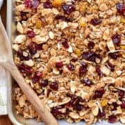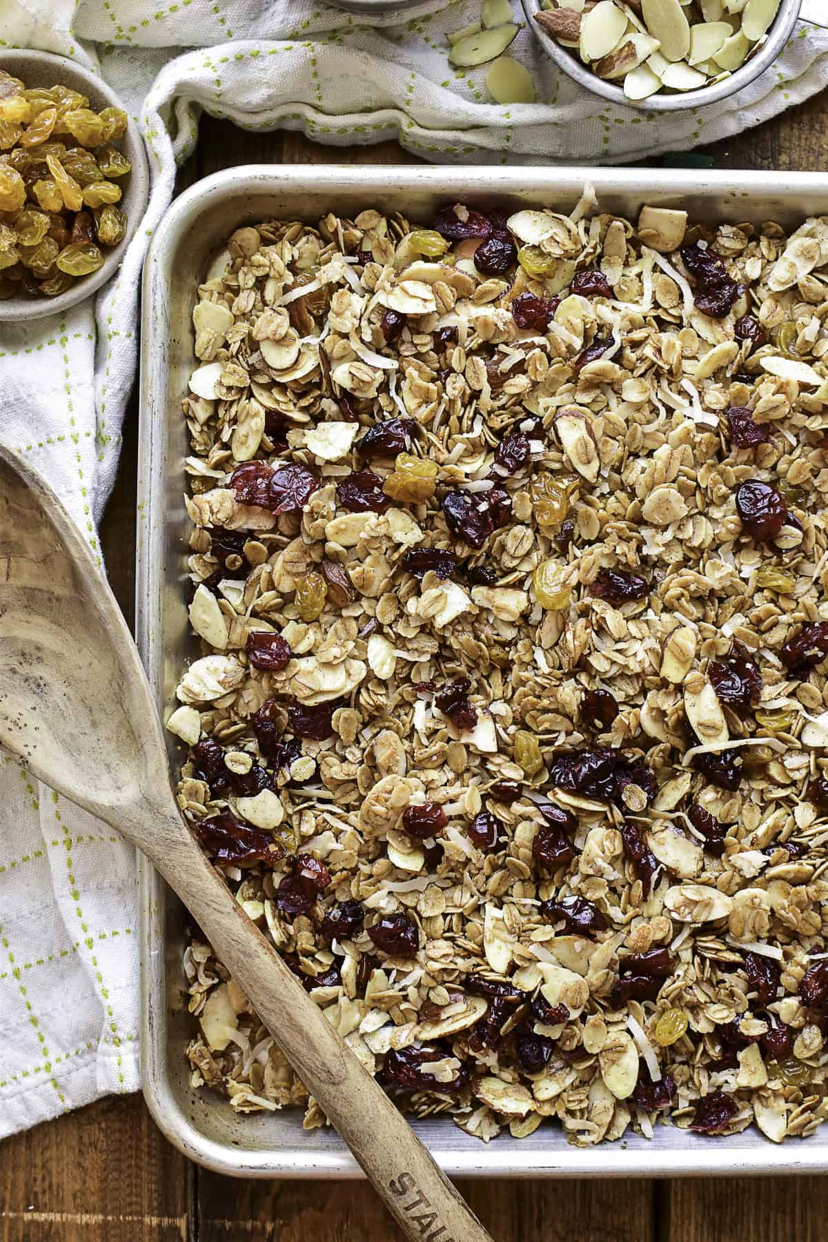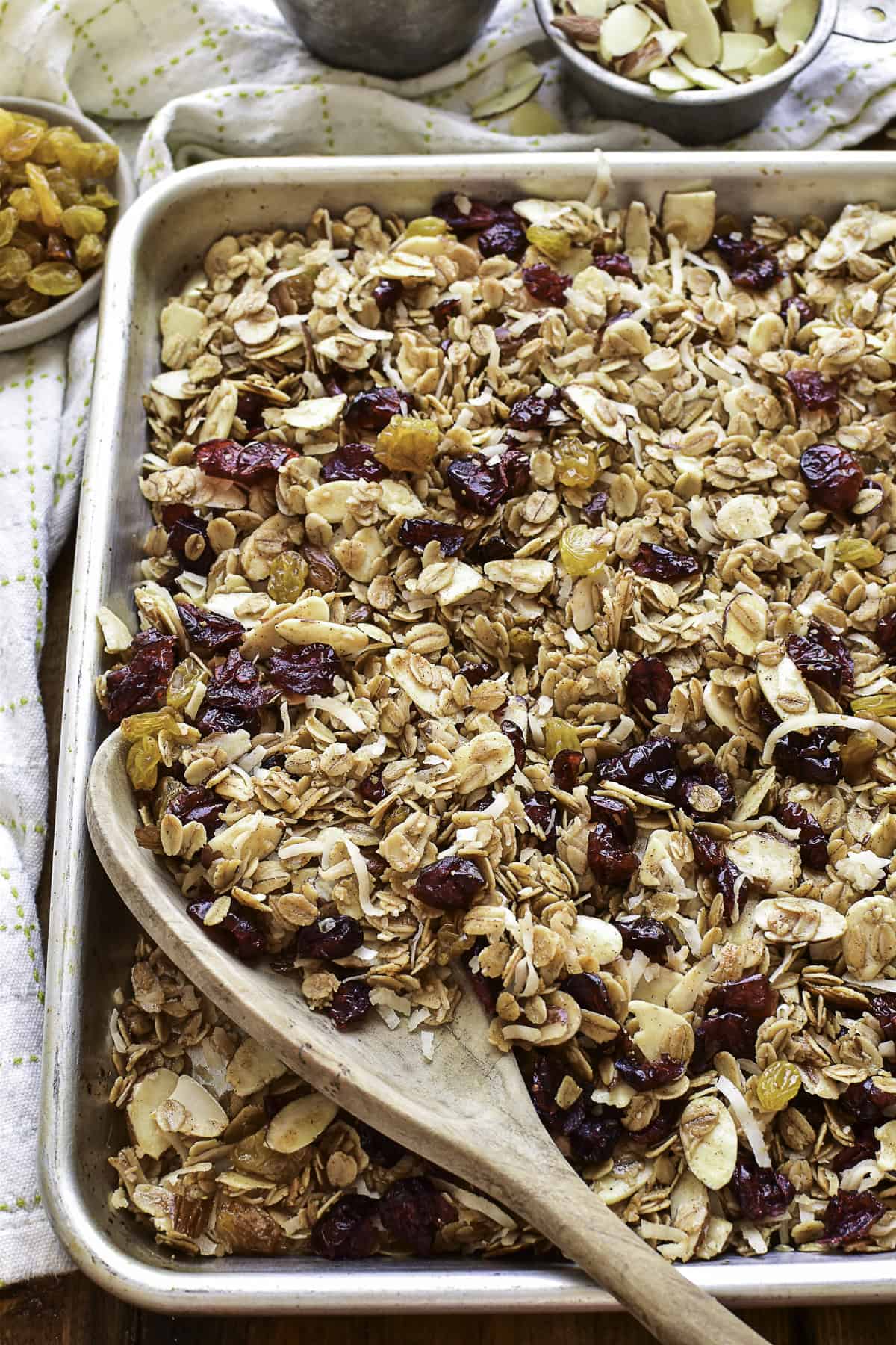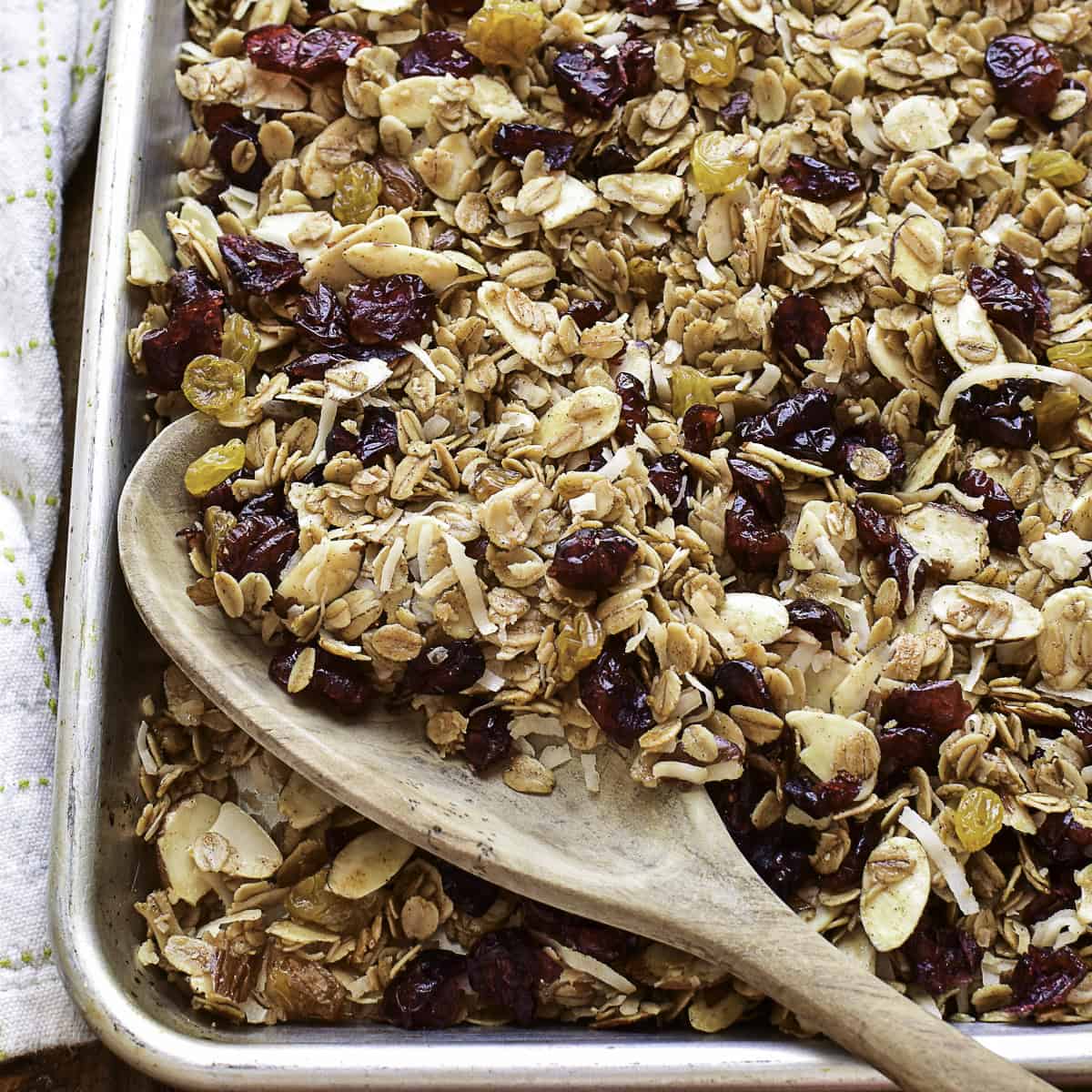 Back when my kids were little I used to make a lot of homemade granola, and I made a few different kinds of it. Like Banana Bread Granola, Blueberry Granola, or this delicious granola I’m sharing with you today. It’s based on a recipe I found and tweaked over 10 years ago, made with sliced almonds, dried cranberries, golden raisins, toasted coconut, brown sugar, honey, and a hint of cinnamon.