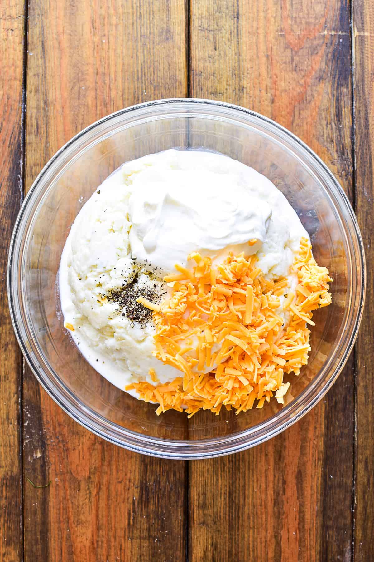 - In a large mixing bowl, combine the mashed potatoes, milk, sour cream, 1/2 cup shredded cheese, salt & pepper. Mix well, then transfer to a 2 quart casserole dish.