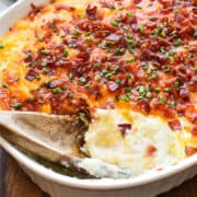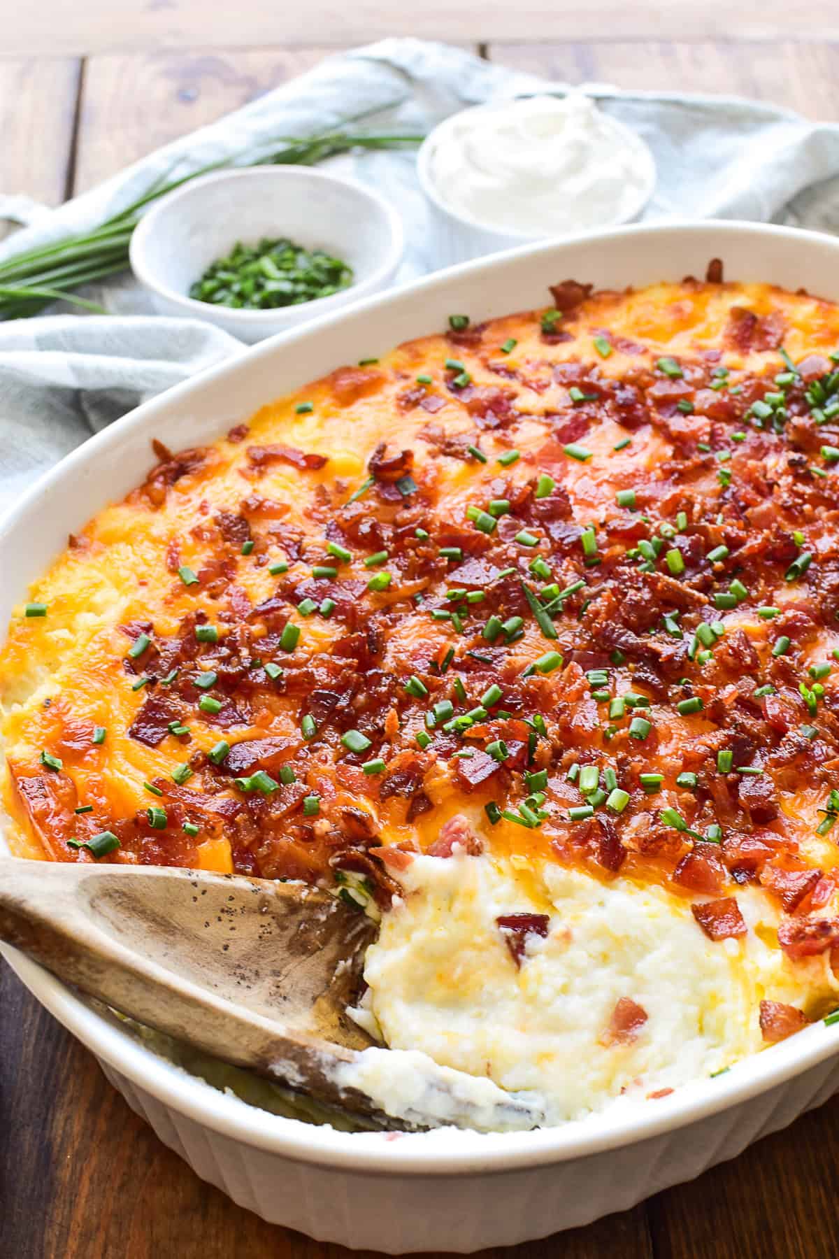 Mashed Potatoes – in casserole form! This Loaded Mashed Potato Casserole is deliciously creamy and packed with the flavors of melted cheddar, crispy bacon and fresh chives. The perfect side dish for any meal!