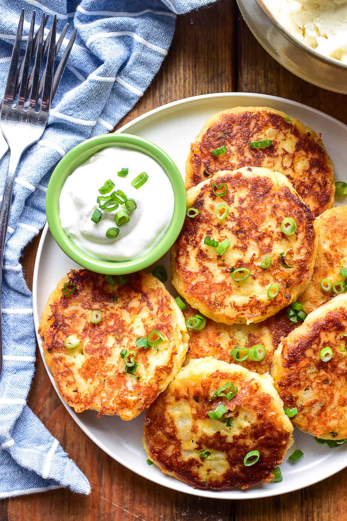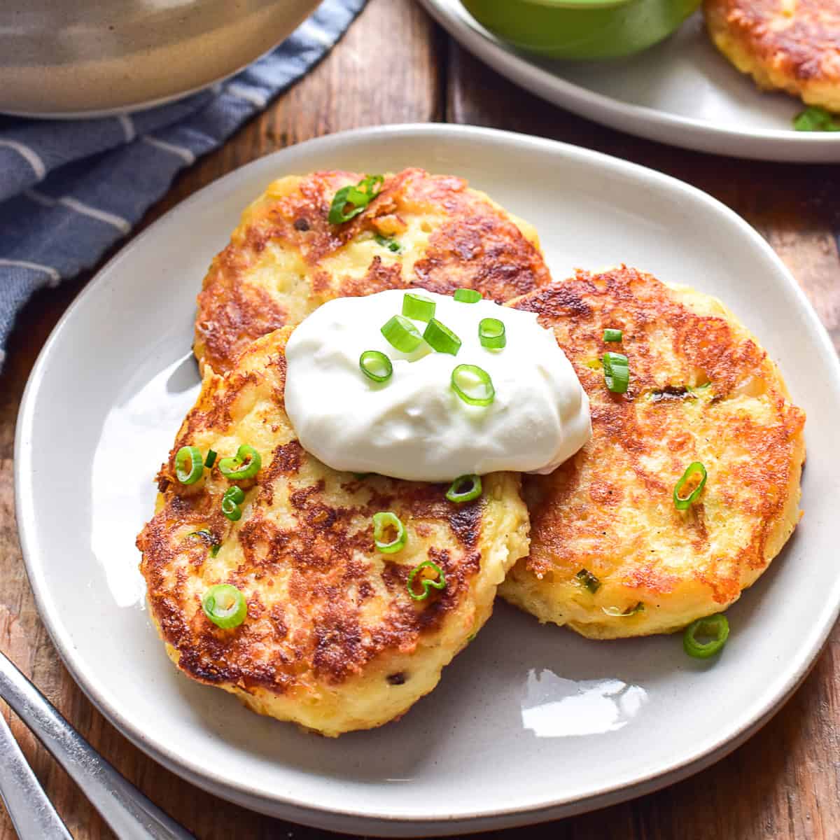 Mashed potatoes – This recipe uses 2 cups of mashed potatoes and makes about 8 potato pancakes. Feel free to halve or double it as needed.