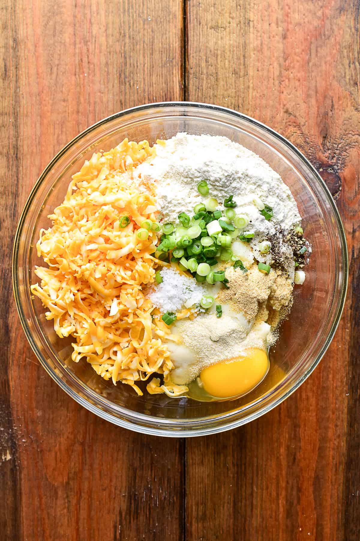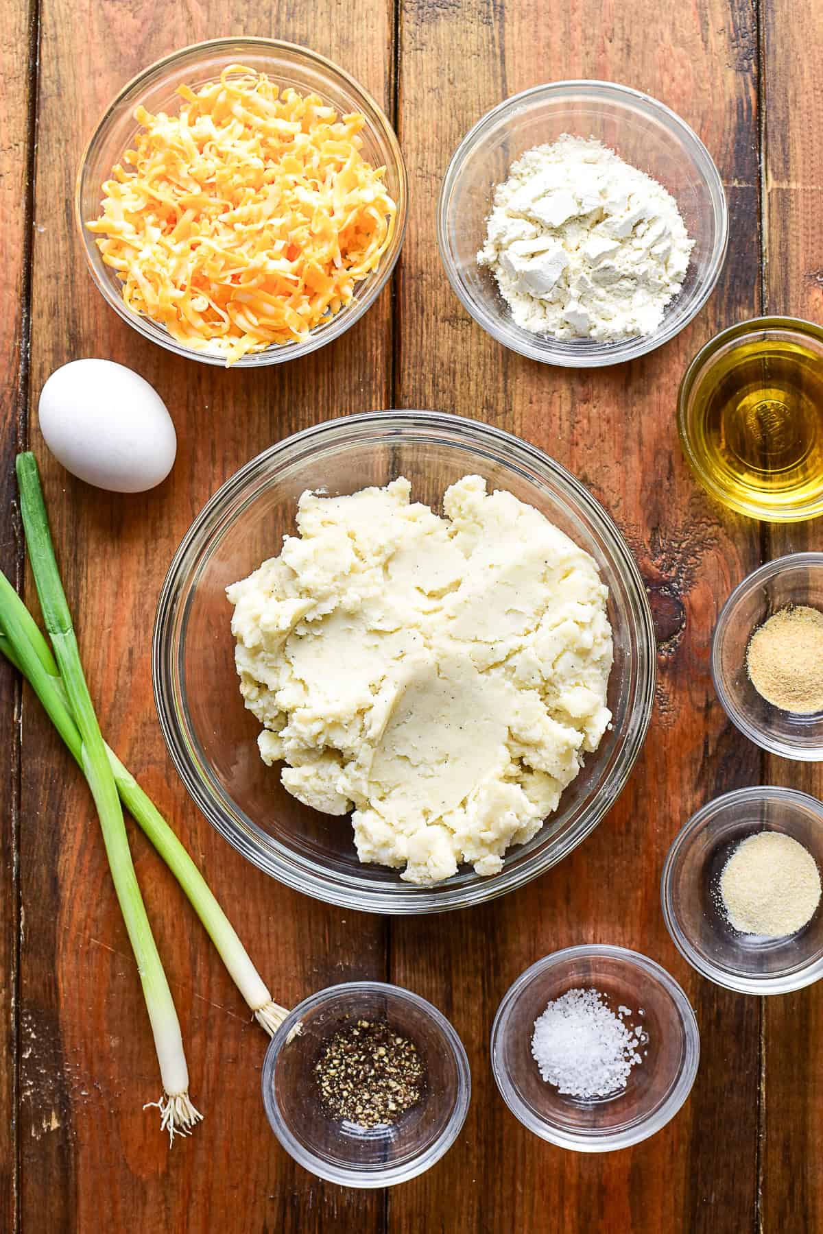 - In a medium mixing bowl, combine the mashed potatoes, flour, cheese, egg, green onions, and seasonings.