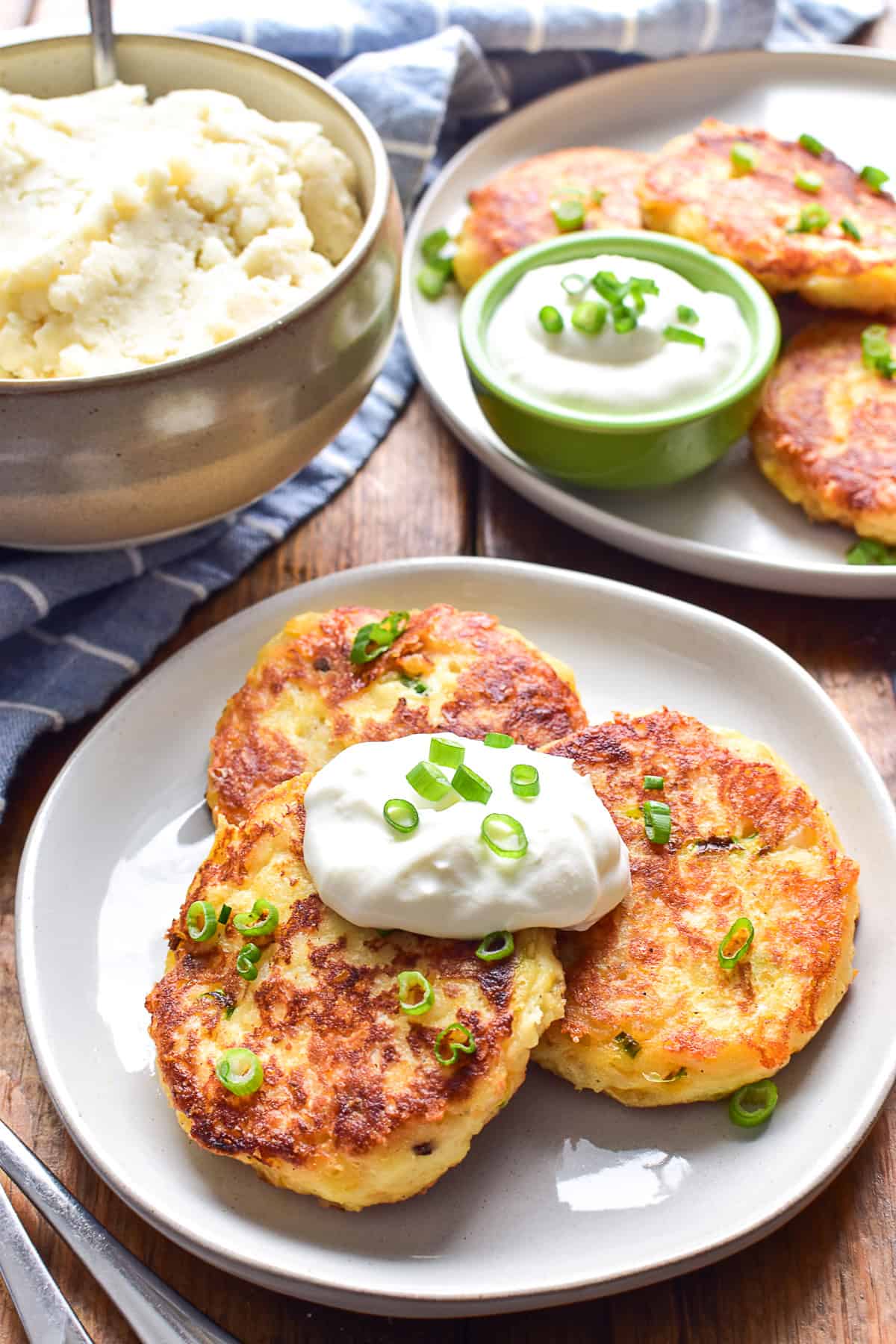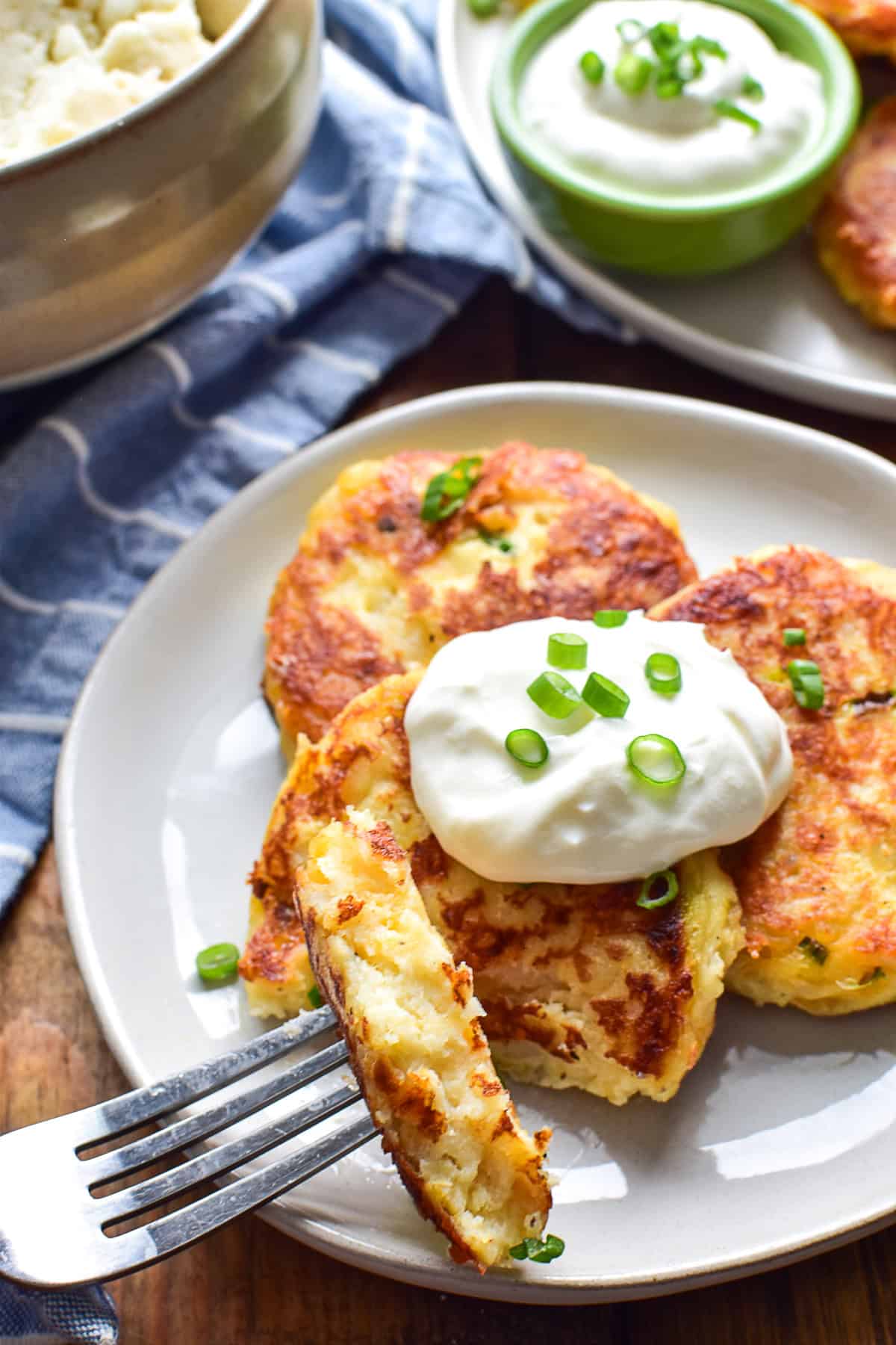 I recently found myself in that exact position, with enough leftover mashed potatoes to celebrate Thanksgiving all over again. So naturally, I made mashed potato pancakes!