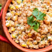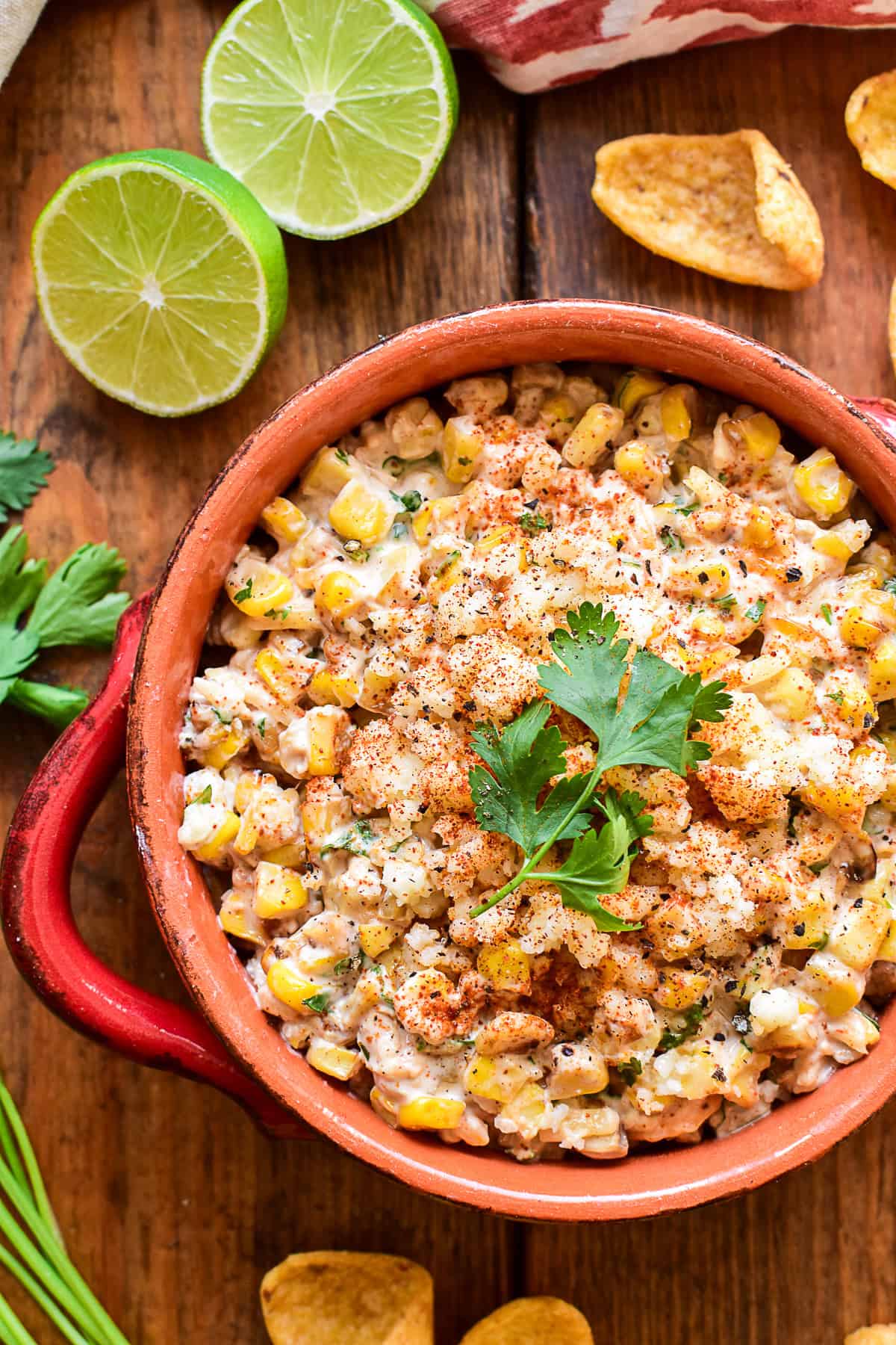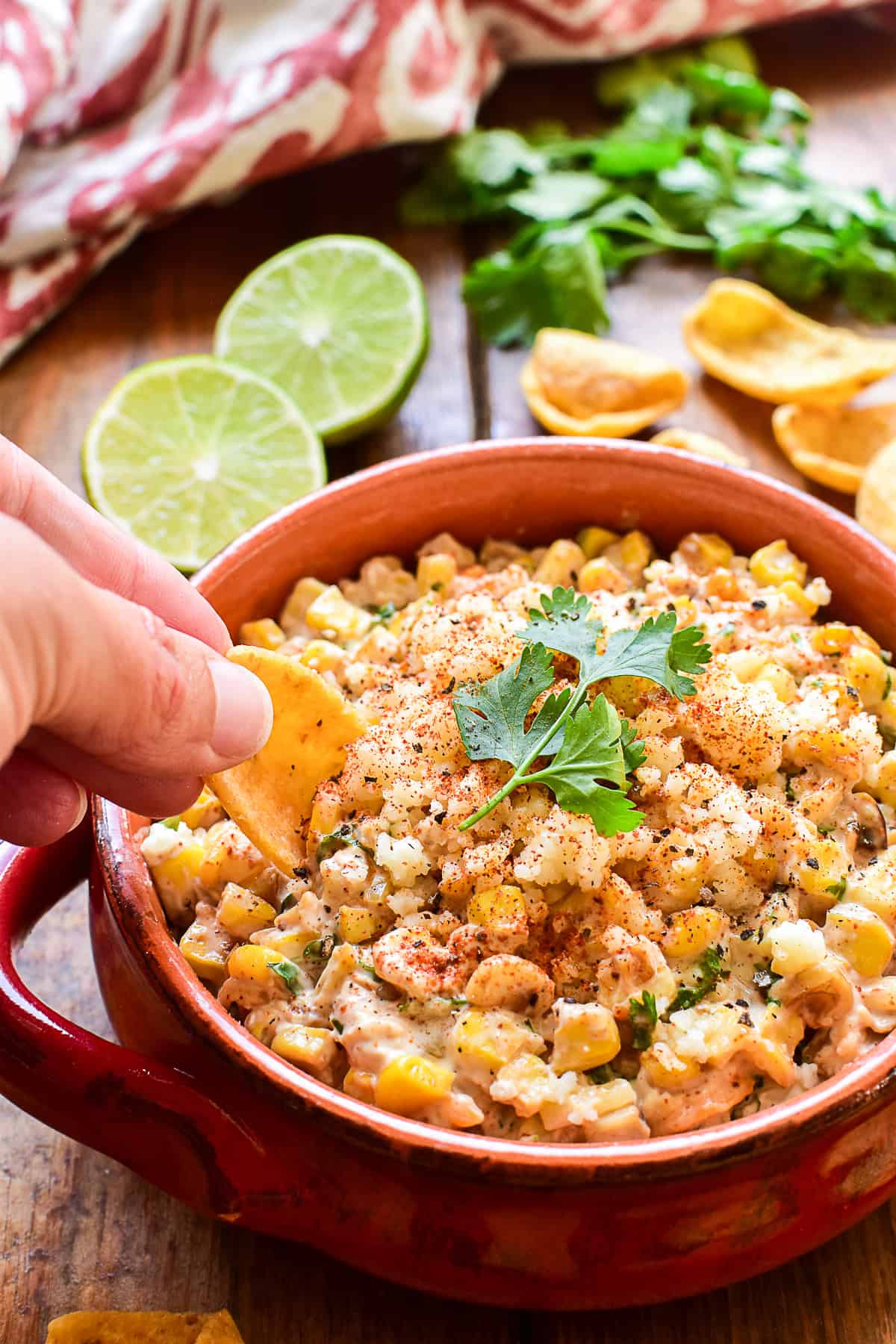 The BEST Mexican Street Corn Dip! This dip is packed with sweet corn, fresh cilantro, cheddar cheese, cotija cheese, and all your favorite seasonings. Completely addictive and so easy to make!