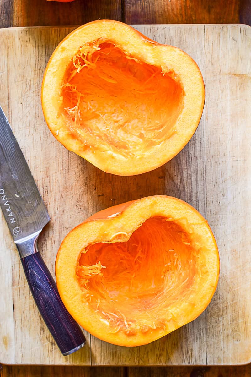 - Cut the pumpkin in half and scoop out the seeds and guts.