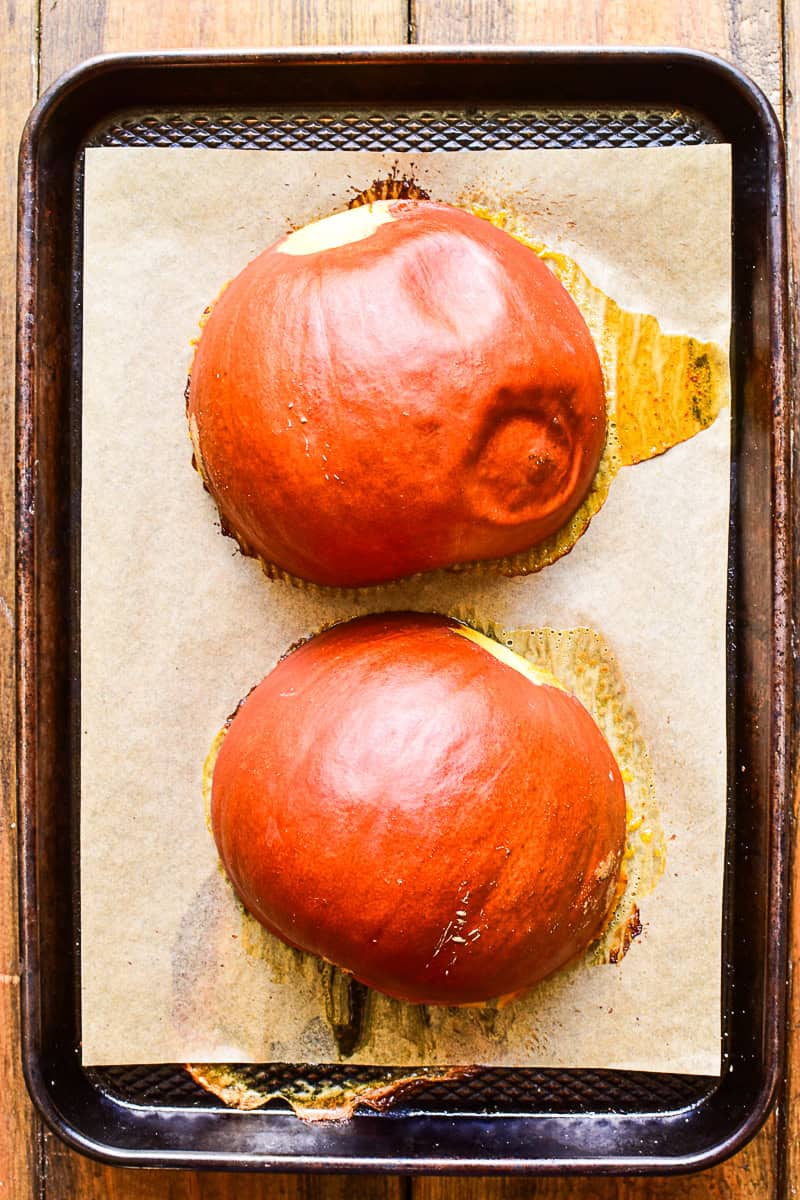 - Place the hollowed out pumpkin halves face down on a rimmed baking sheet lined with parchment paper. Bake at 400° for 45 minutes or until the flesh is fork tender and the skin starts to pull away from the flesh naturally.