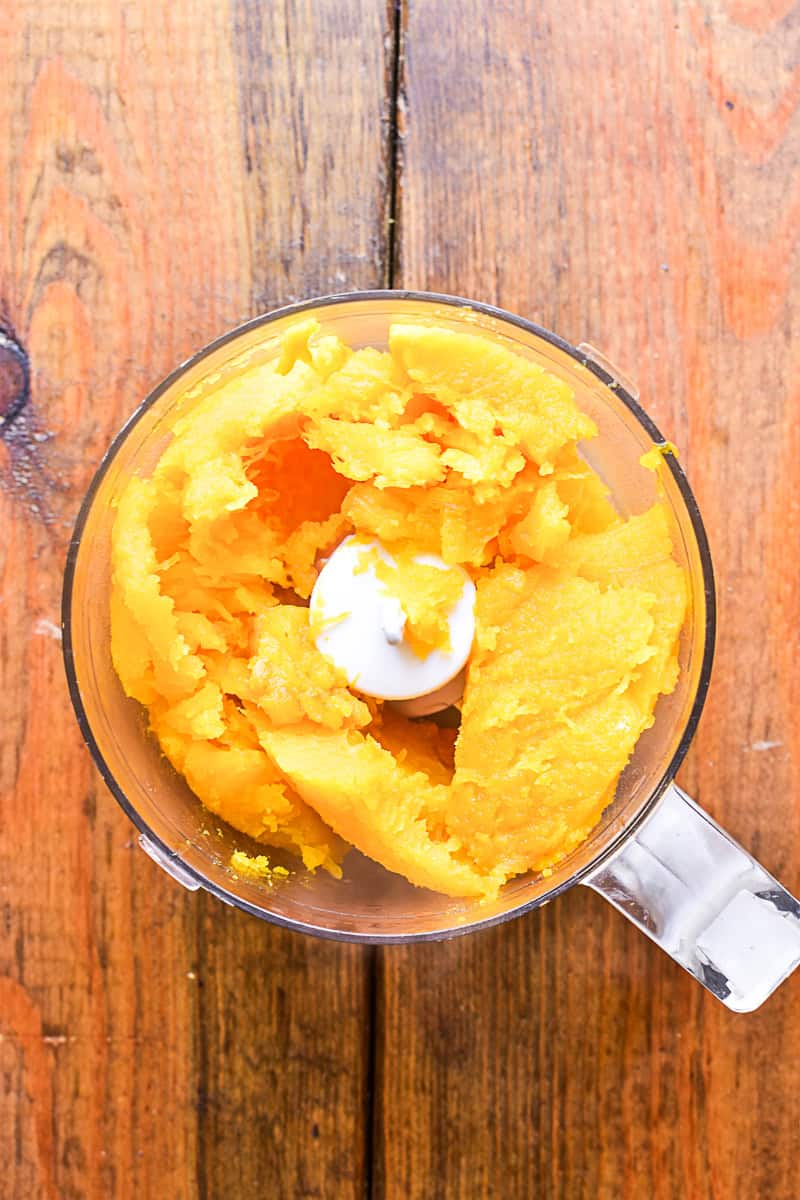 Step 3: Remove the skins and let the pumpkin cool. Spoon it into a food processor and process until smooth, about 2-3 minutes.
