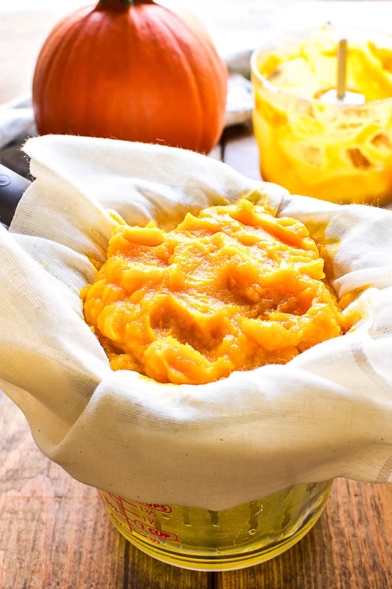 Step 4: Spoon the puree into a fine mesh strainer lined with cheesecloth. Gather the edges together and squeeze to strain off excess liquid. The goal is a texture similar to canned pumpkin puree. *Note: pumpkins vary in moisture level, so some may not need straining while some may need quite a bit of straining.