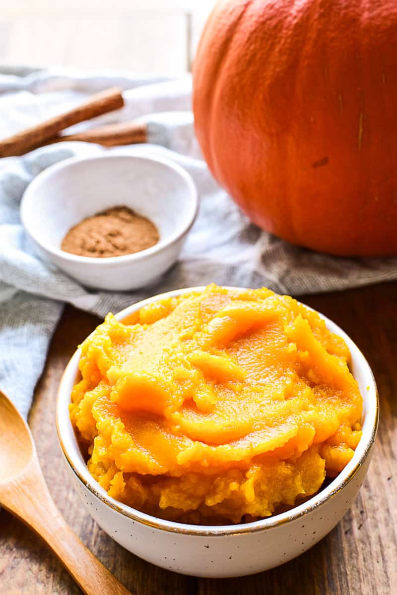 Use the right kind of pumpkin. Pie pumpkins (aka sugar pumpkins) are it! It’s all in the name, really. This type of pumpkin is bred for pies and baking of all types.