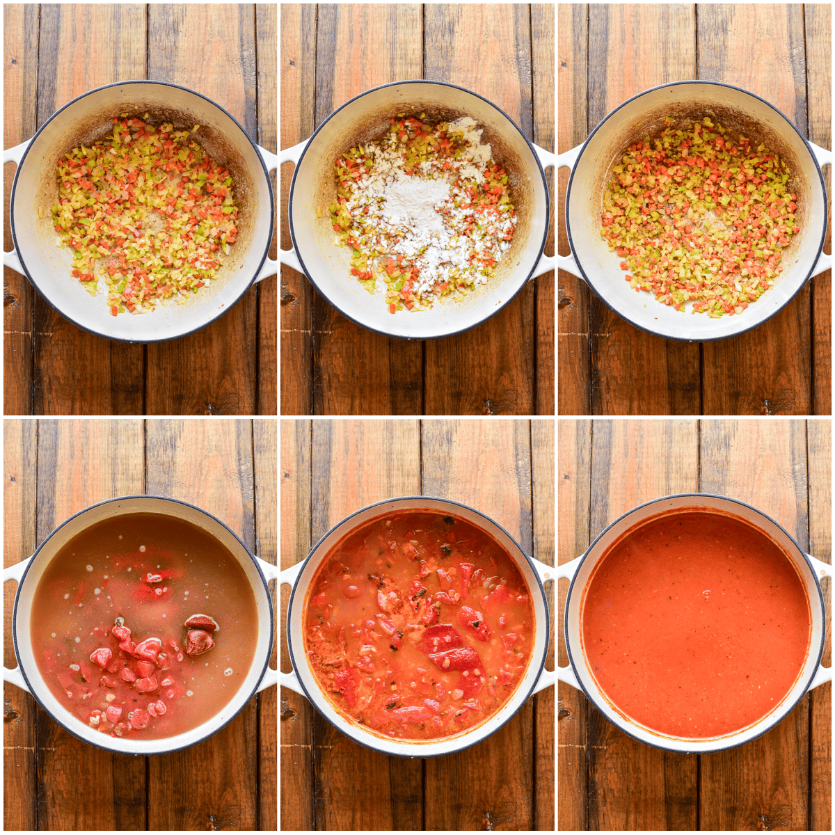 Sauté the vegetables. Melt butter in a large stock pot over medium heat. Add the chopped onion, carrot, celery and garlic. Cook, stirring regularly, 5 minutes or until vegetables are tender and starting to brown.
