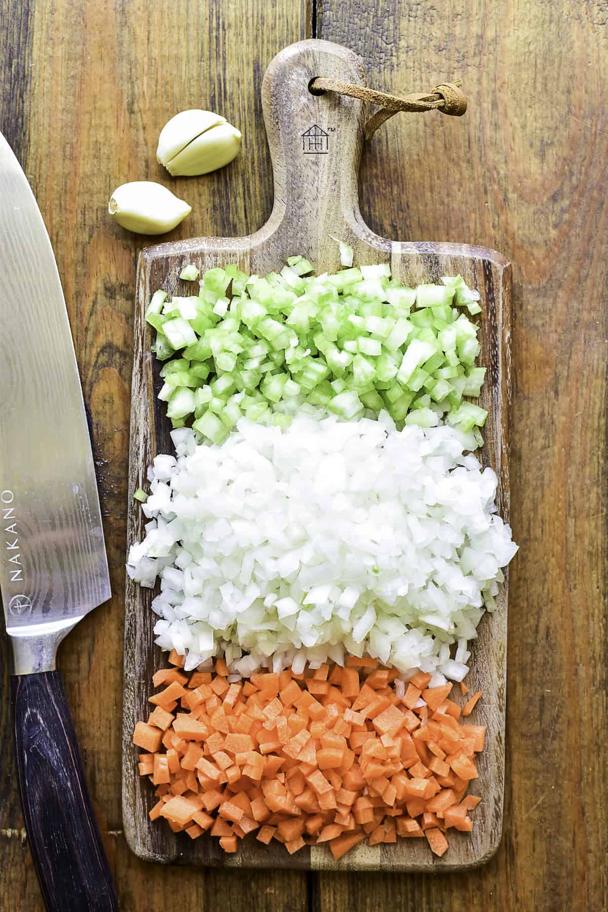 Onion/carrot/celery – A combination of chopped onions, carrots, and celery – also known as mirepoix – forms the base of this soup. It’s a common foundation for soups, stews, and sauces, adding depth and complexity of flavor.