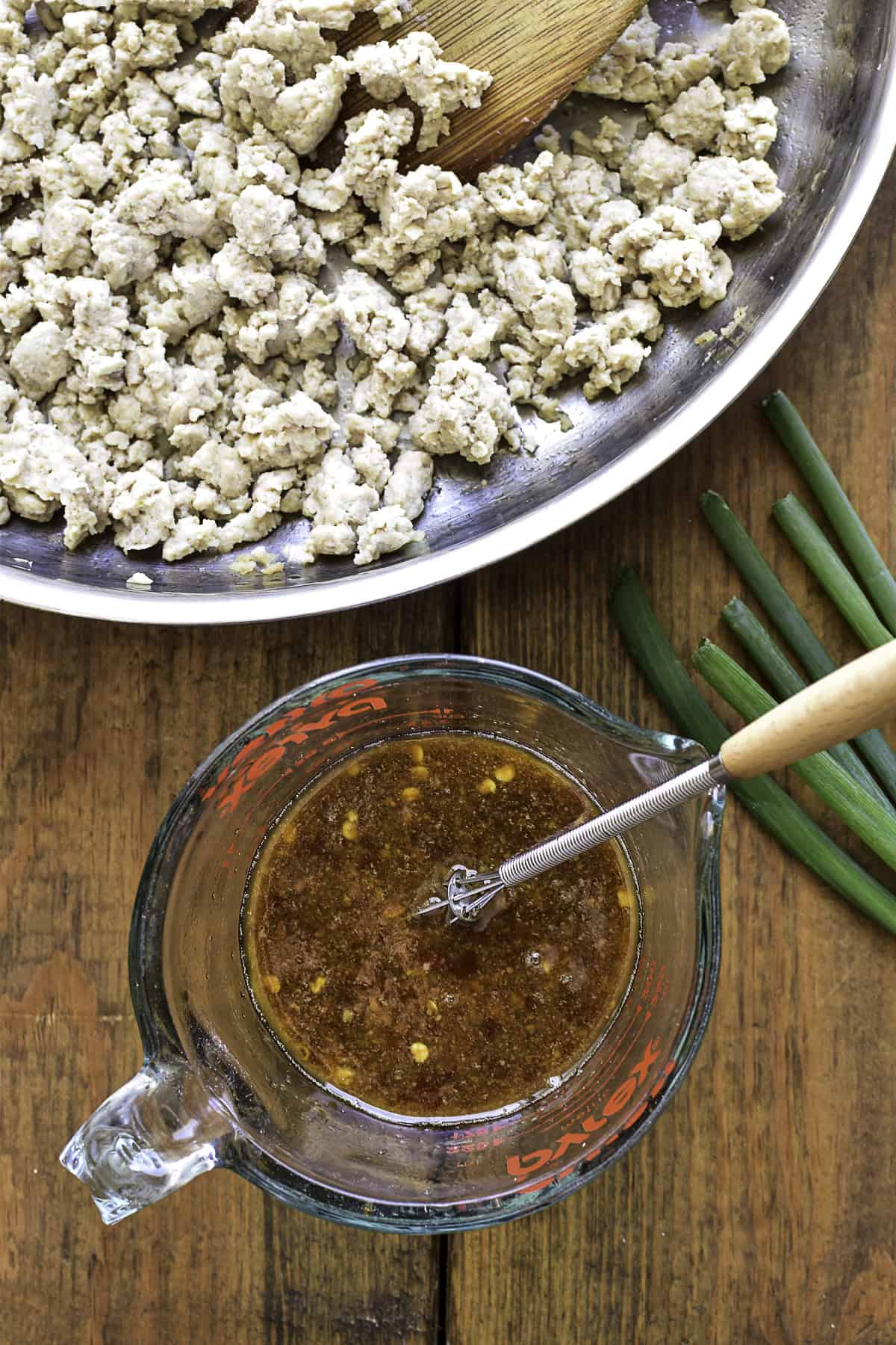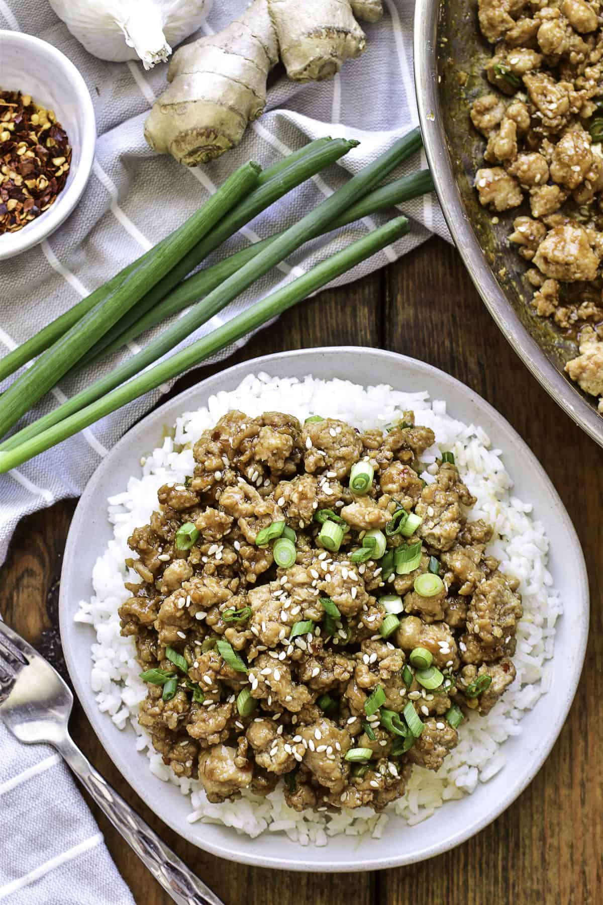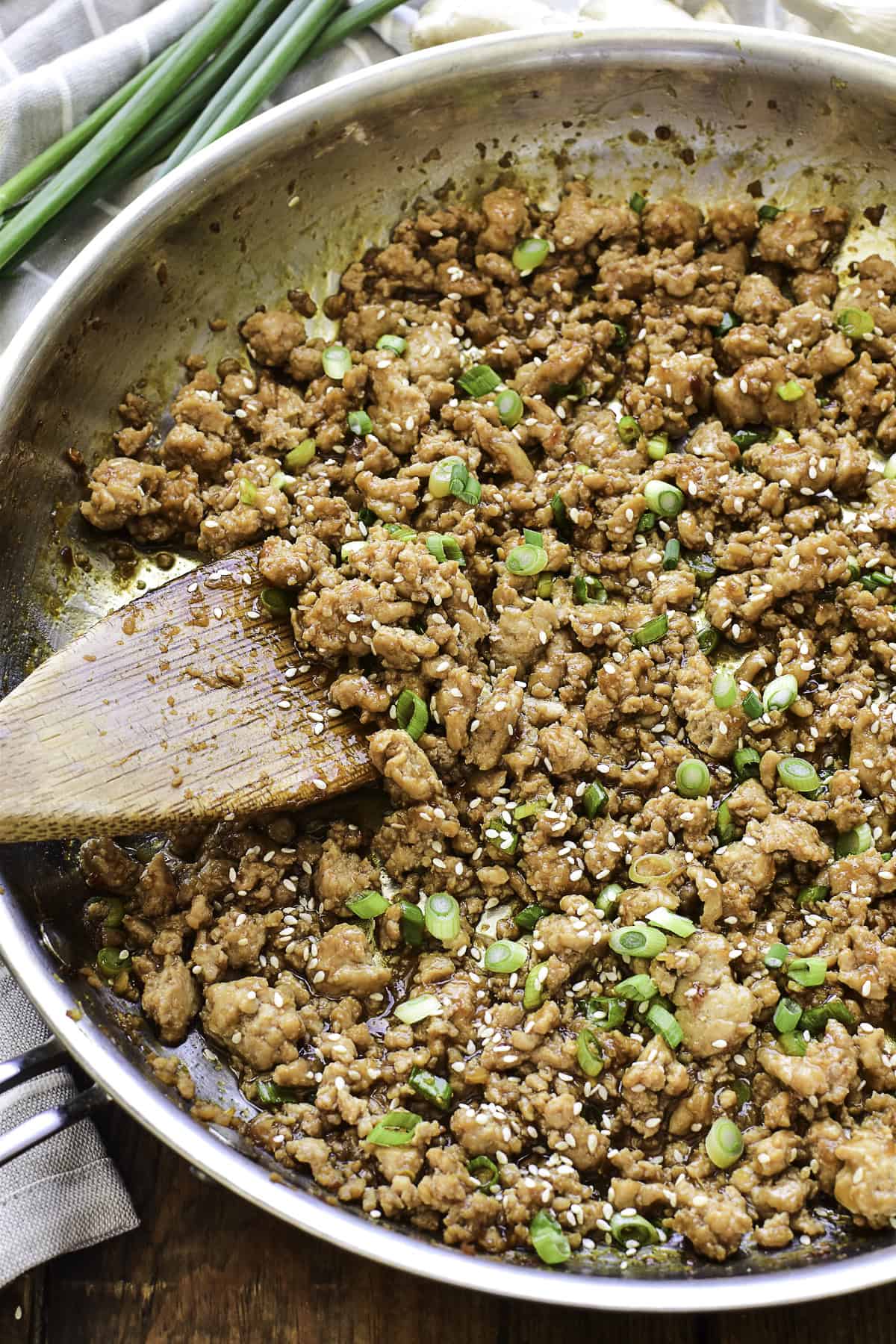 Garnish with green onions & sesame seeds. Garnish with sliced green onions and sesame seeds; serve over white rice or in in lettuce wraps.
