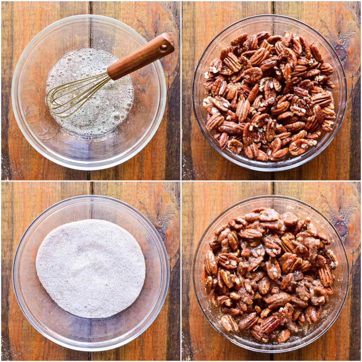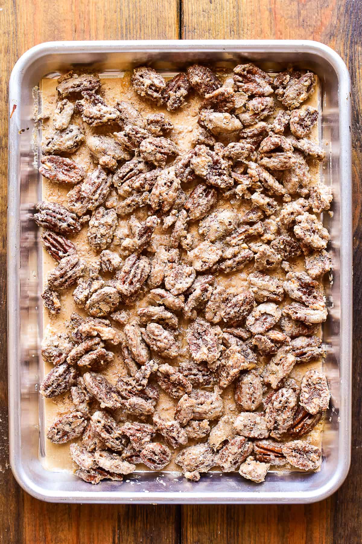 Fully coat the pecans. Be sure the pecans are fully coated at each step. The egg white mixture helps the sugar stick, and the sugar mixture is what gives them flavor!