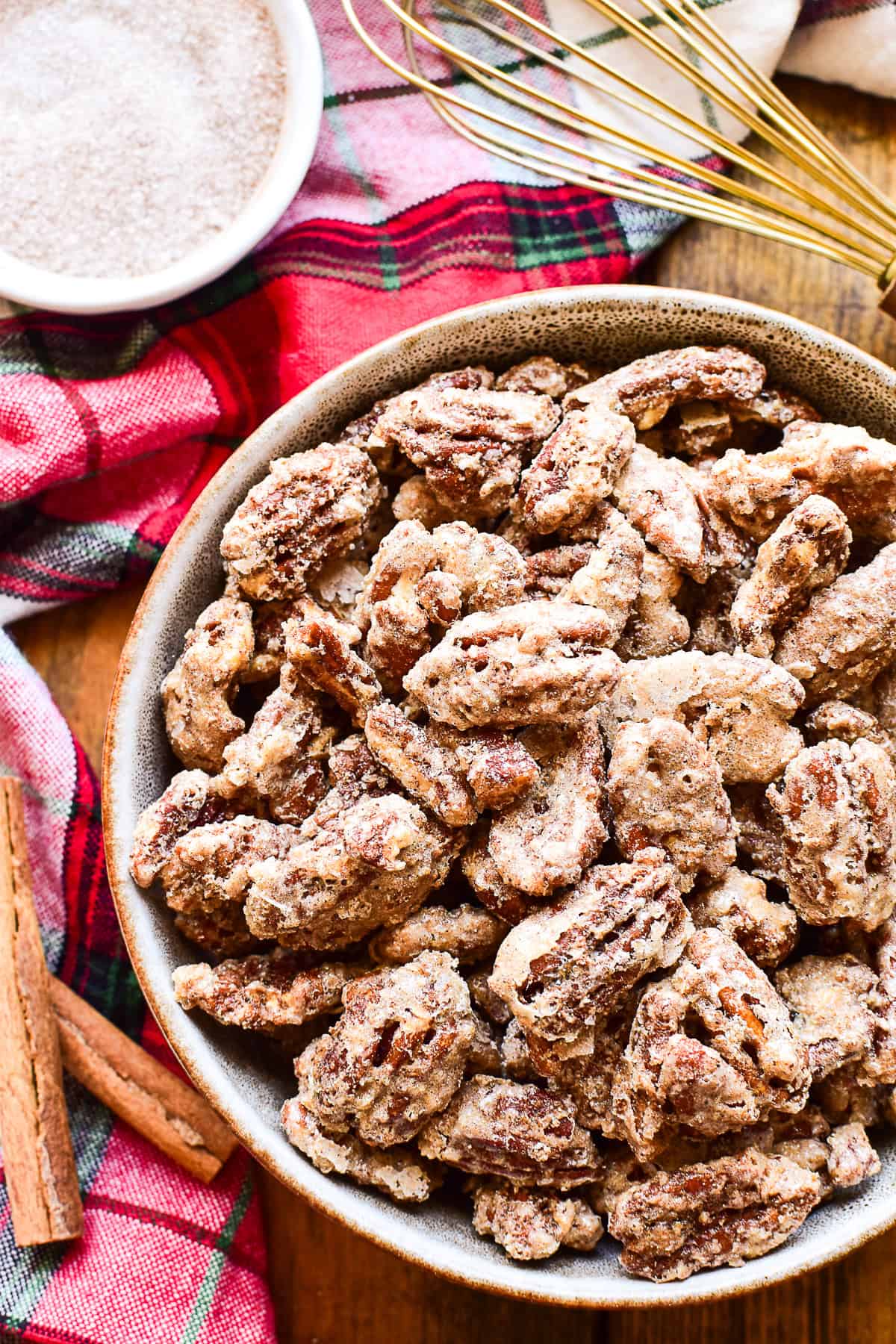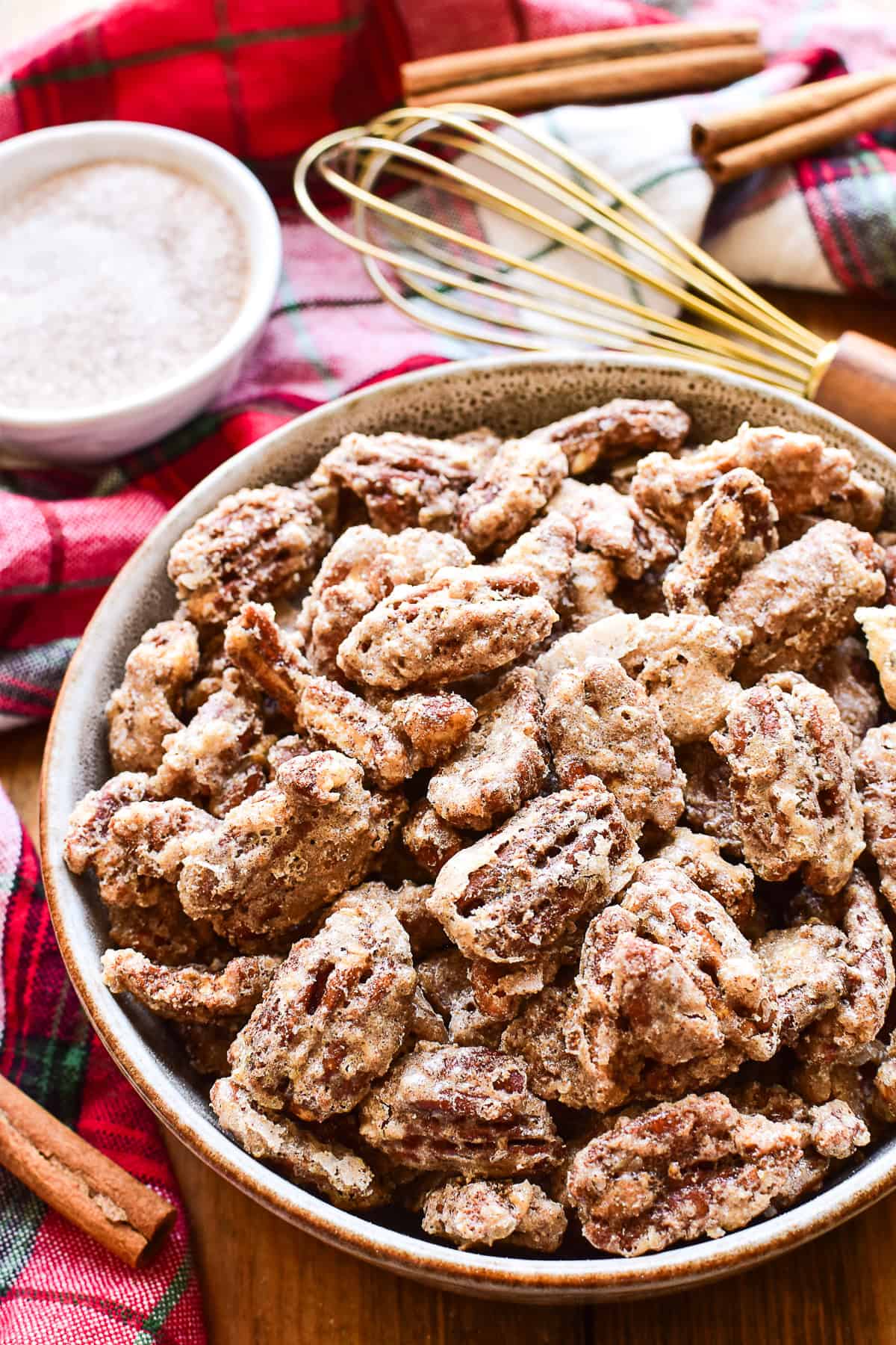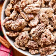 Fully coat the pecans. Be sure the pecans are fully coated at each step. The egg white mixture helps the sugar stick, and the sugar mixture is what gives them flavor! Use parchment paper. Line your baking sheet with parchment paper for no sticking and easy cleanup! Spread in a single layer. Be sure to spread the pecans out in a single layer (as much as possible) for even baking. Don’t over-bake. Watch closely near the end and remember that the coating won’t fully harden until after they cool.Recipe Variations