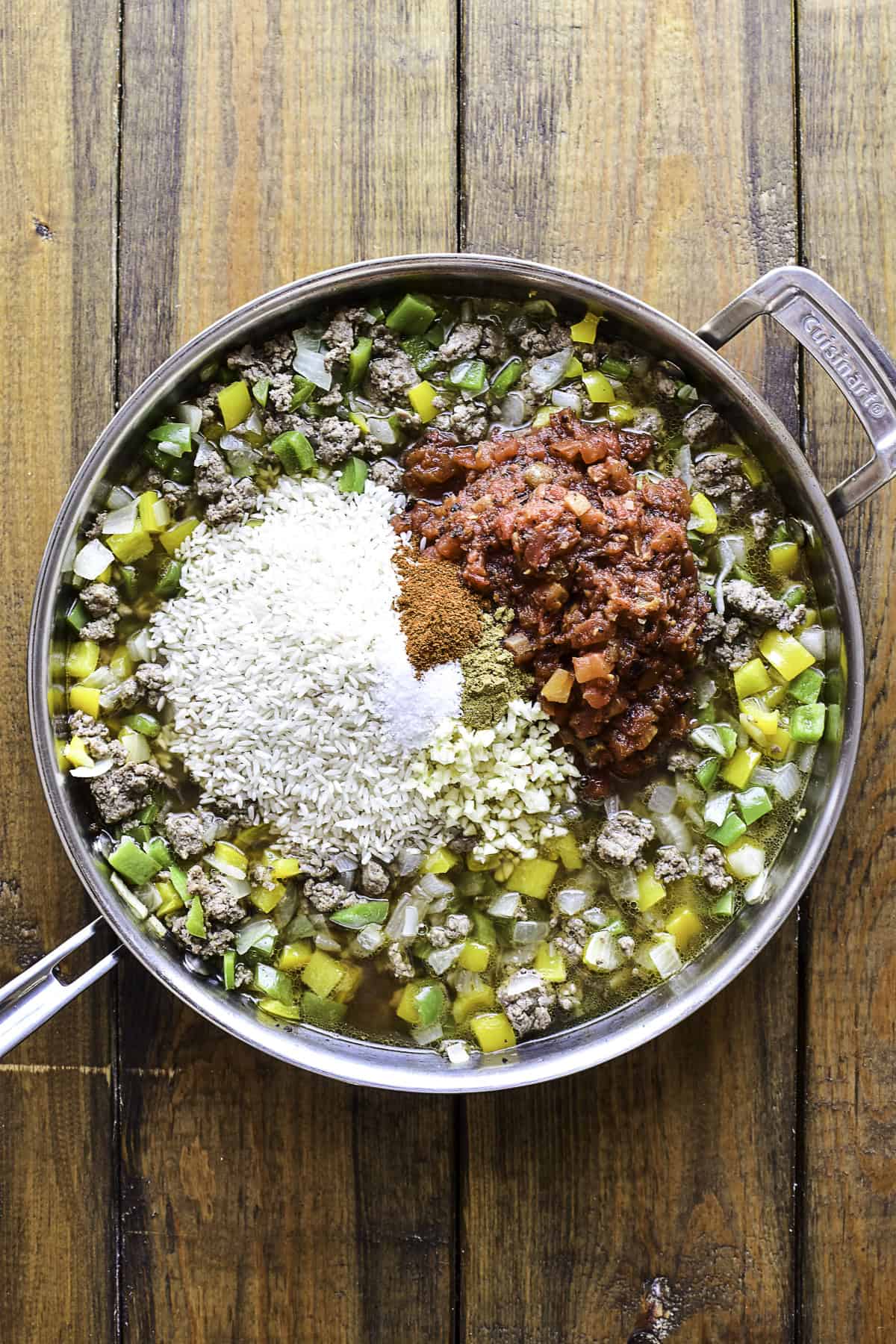 Step 2: Add the tomatoes, rice, broth & seasonings. To the same skillet, add the canned tomatoes, beef broth, uncooked rice, minced garlic, and dried spices. Return to medium-high heat and cook for 5 minutes. (The mixture will be boiling gently.)