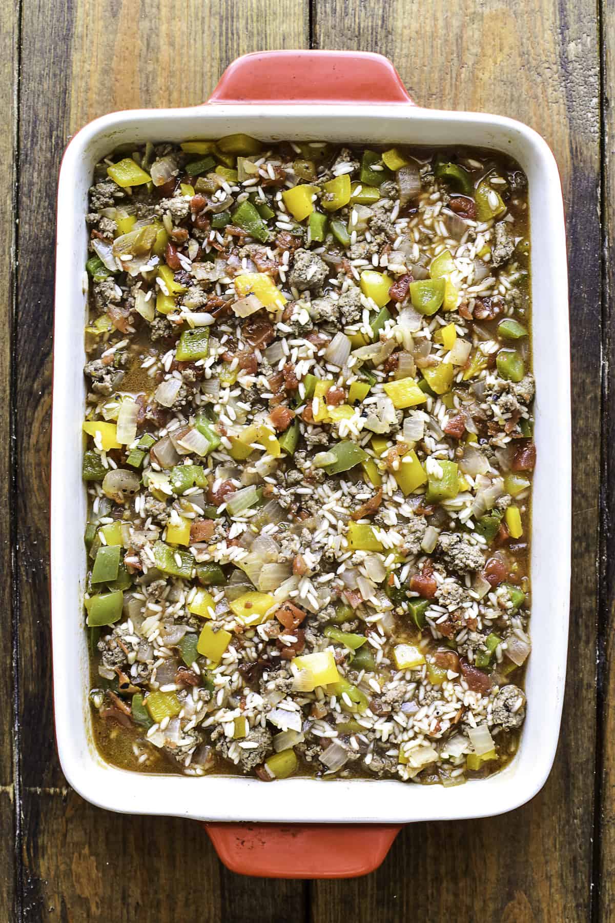 Step 3: Bake. Transfer to a 9×13 inch baking pan and cover with foil. Bake at 350° for 1 hour, then check for doneness. If the rice is under-cooked, bake for 10-15 minutes more. Remove from oven and sprinkle evenly with cheese. Bake for an additional 5-10 more minutes or until cheese is fully melted.