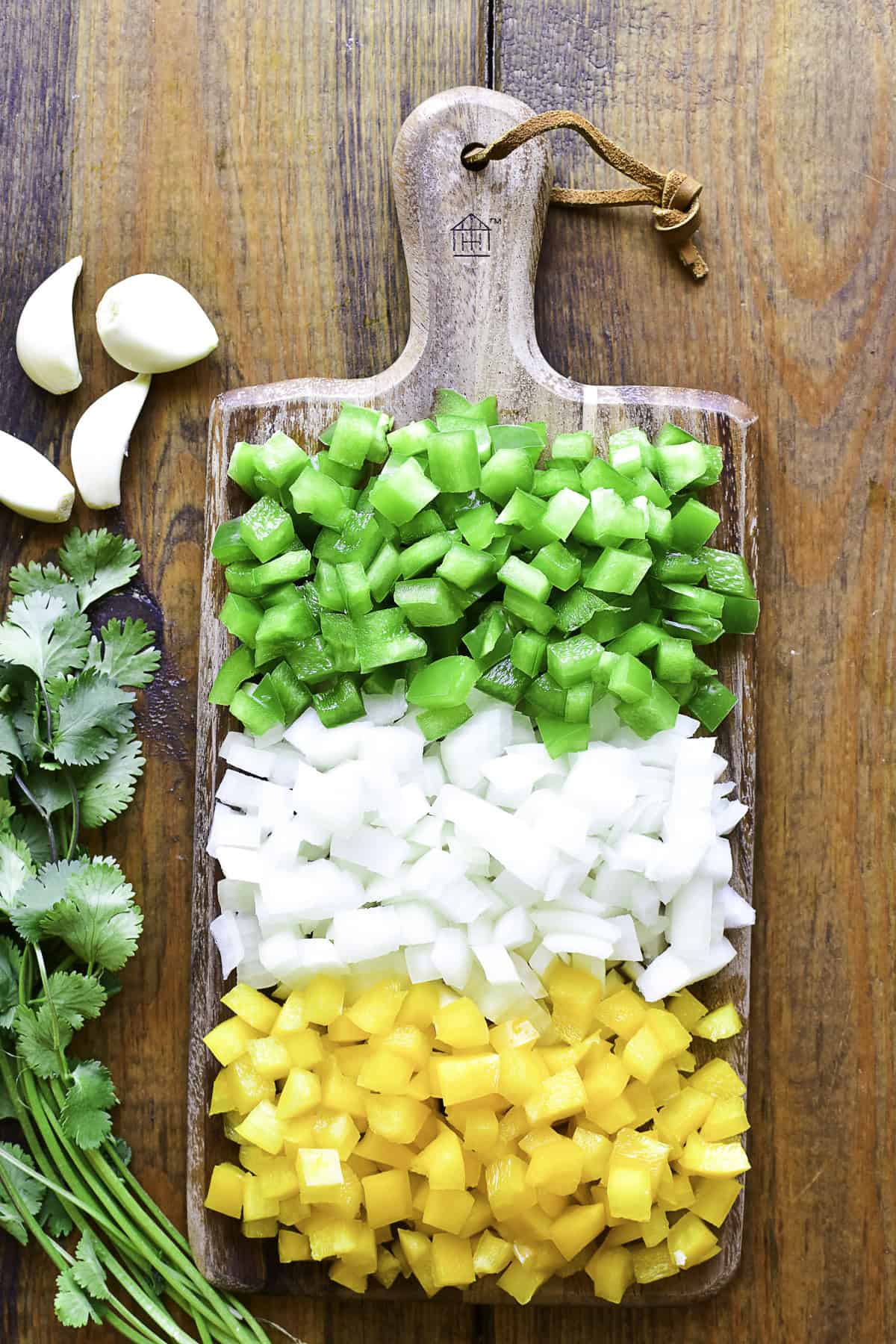 - Dice the bell peppers and onion into uniform pieces; set aside.