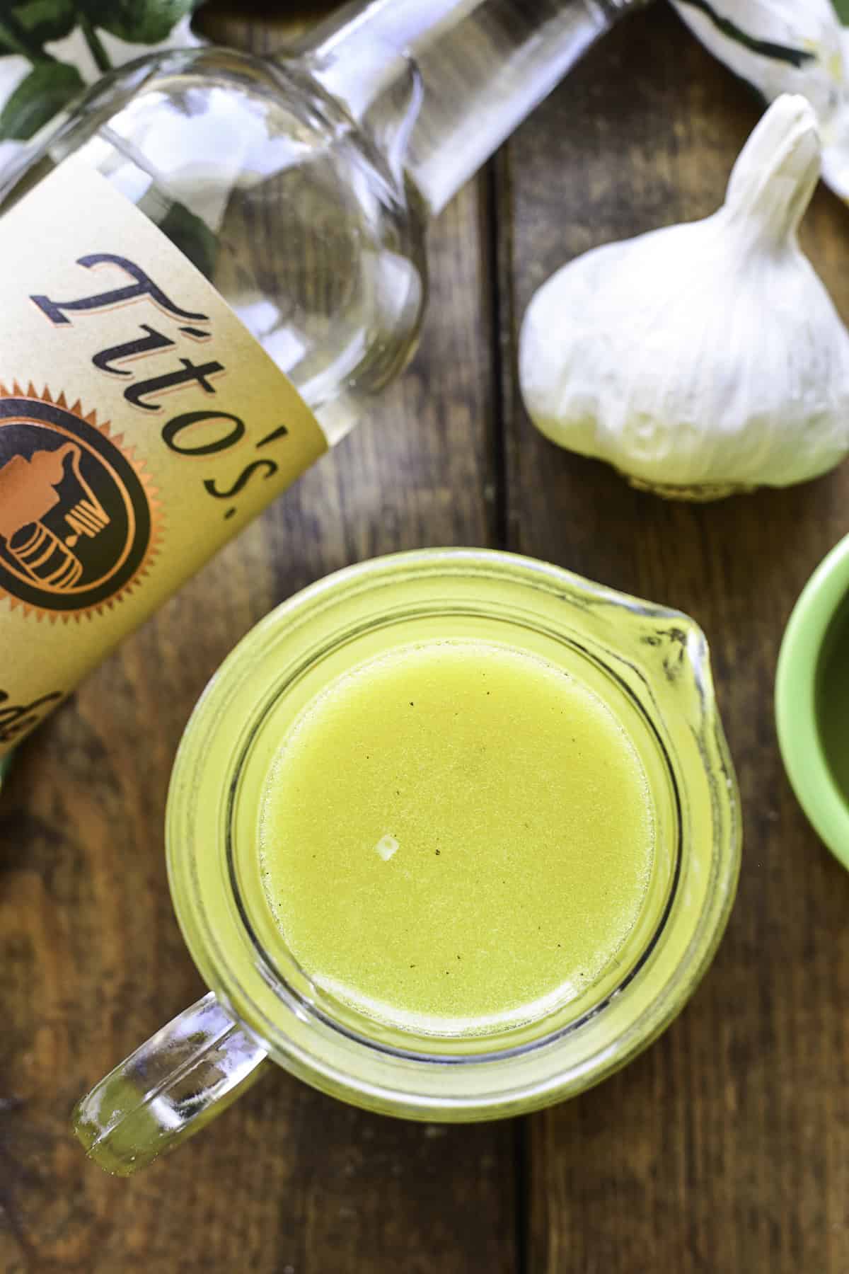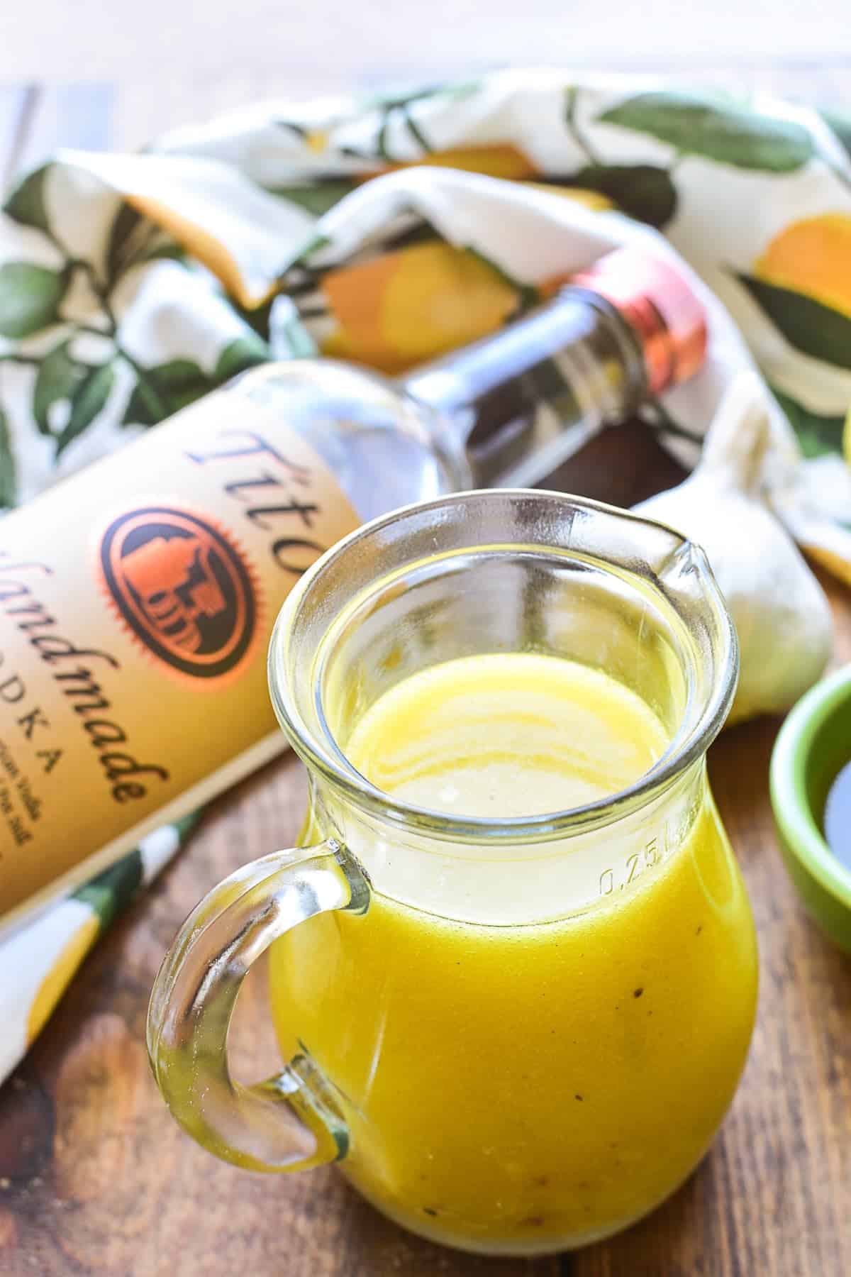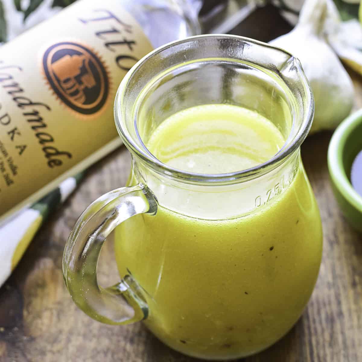 Made with a simple combination of olive oil, lemon juice, onion, garlic, salt, pepper, and… of course… vodka, it’s the perfect savory dressing for so many salads. Why vodka, you ask? Adding vodka enhances the flavor, adds brightness, and acts as an emulsifier, binding the oil and lemon juice together. And no… it doesn’t taste like vodka. But it does taste DELICIOUS.